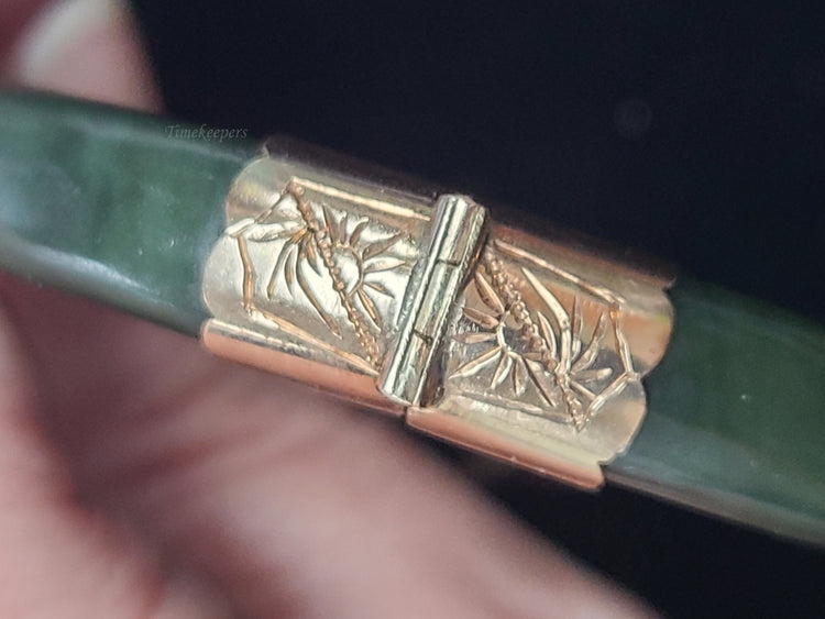 This is a beautiful jade bangle bracelet indeed. The gold sections of this bracelet have a rosy color to them. Which would suggest copper was used in the mixture of the gold. Each gold section is adorned with a beautiful rising sun over the water etching. (At least that's what it looks like to me =) Would fit up to a 7" wrist. 14kt gold hinge and clasp. Stamped 14k on the female side of the clasp. Would be a nice Valentine's Day gift for her!