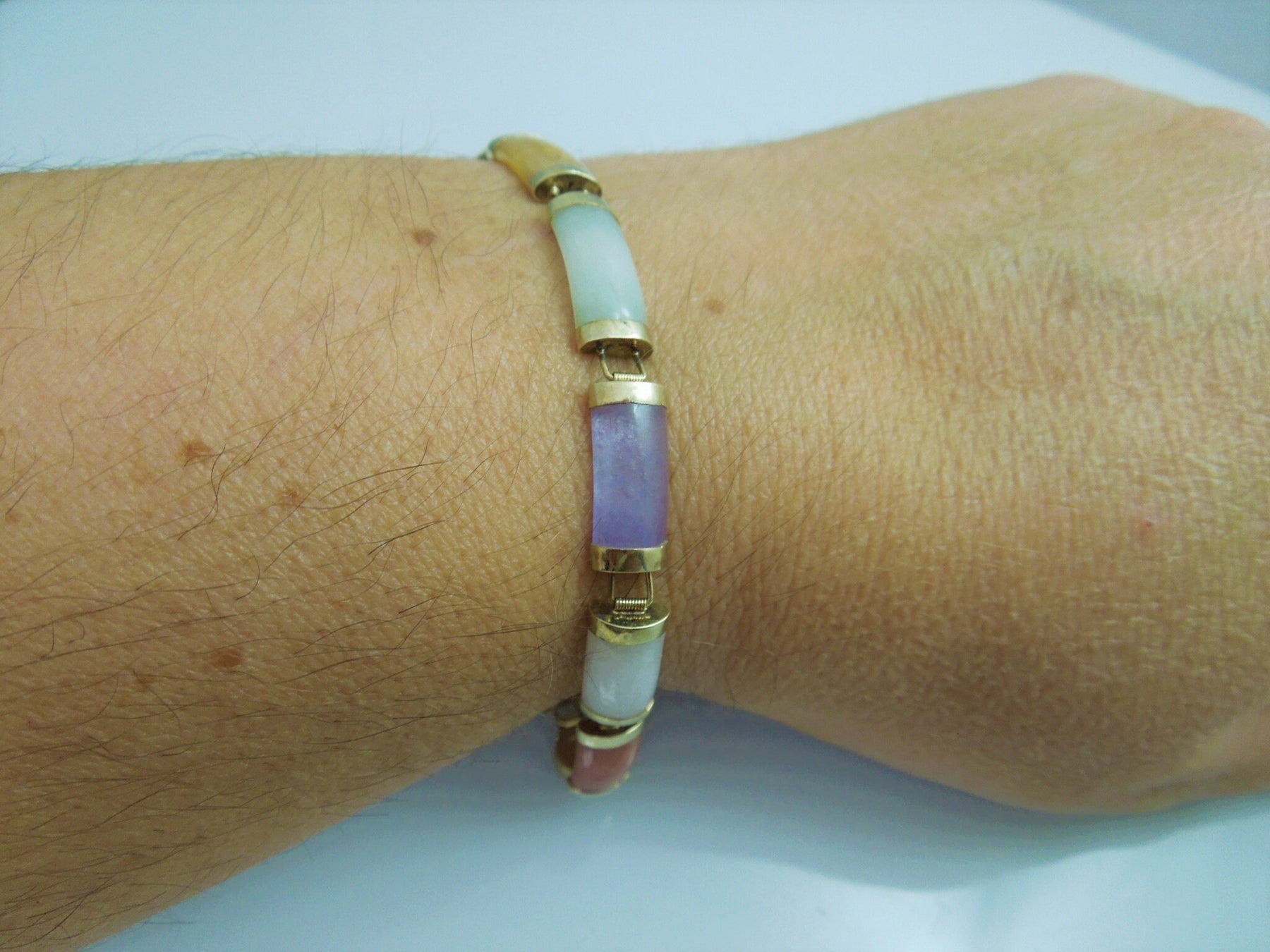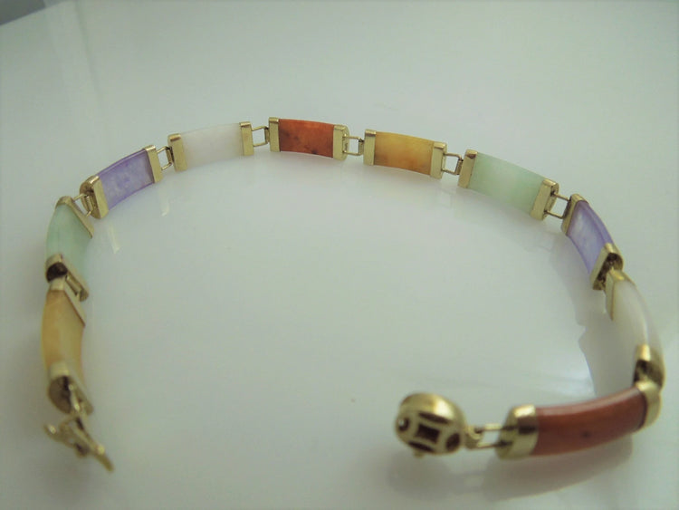 g908 Beautiful 14kt Yellow Gold Multicolored Jade 8" Bracelet