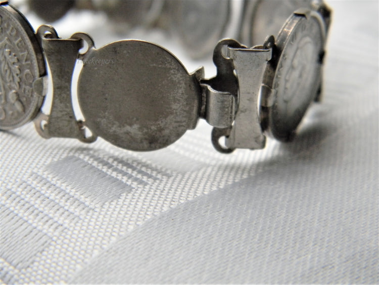 Pre-owned vintage item. Good condition. Sold as is, as seen on pictures. There is some wear and tarnish on this bracelet. No returns on vintage/antique items. WWII Sweetheart British Silver Coin Bracelet with 1930 and 1935 Coins.