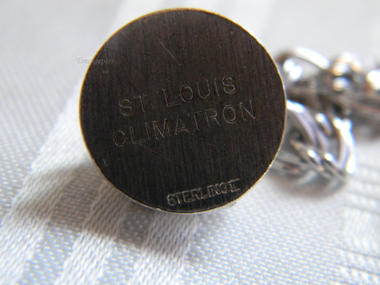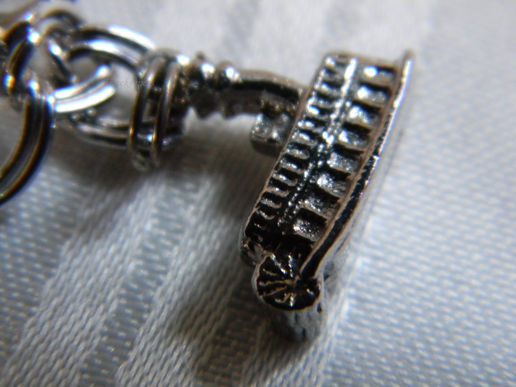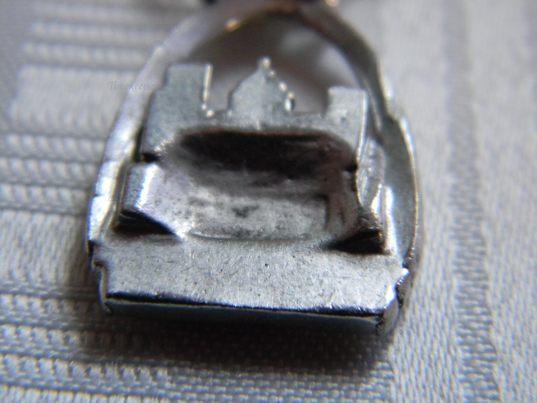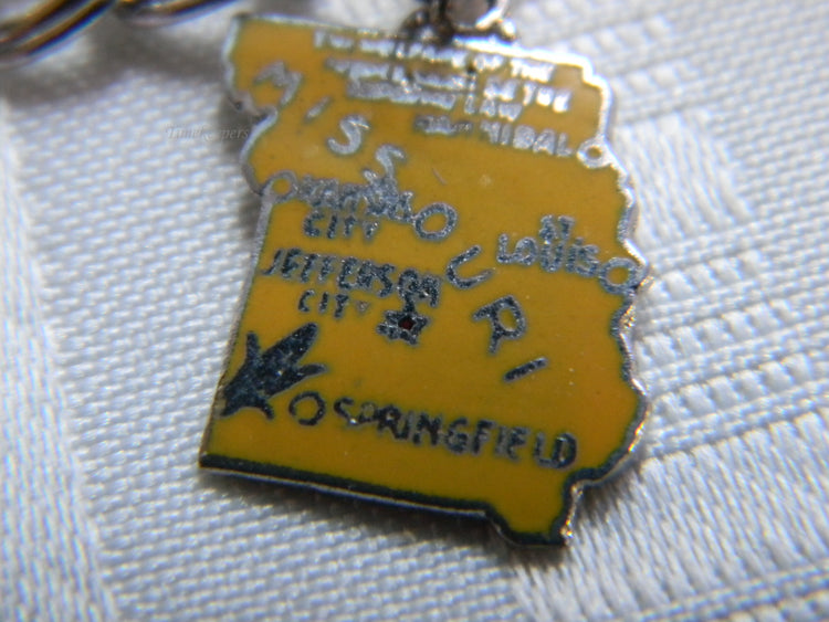 This lovely charm bracelet features 4 charms from St. Louis, MO. One is the St. Lois Climatron, marked sterling. The next is a skyline of downtown St. Louis with the Gateway arch. There is also a map of the state of Missouri with yellow enamel marked Sterling. The last is a Steamboat marked Sterling.
