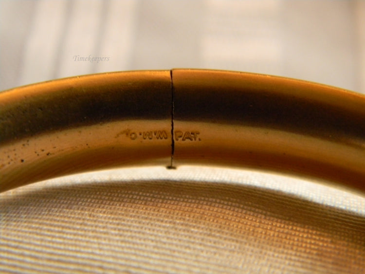 This is a lovely yellow gold filled satin finish hinged bangle bracelet with (3) amethyst stones across the top. The slide in clasp works as it should. The inside of the bracelet is marked W.M.O. Pat.
