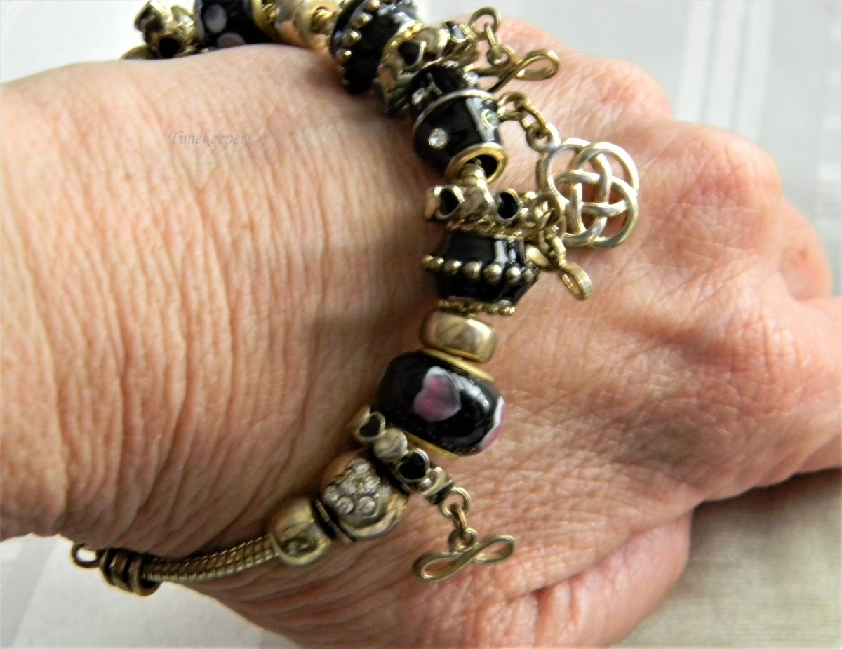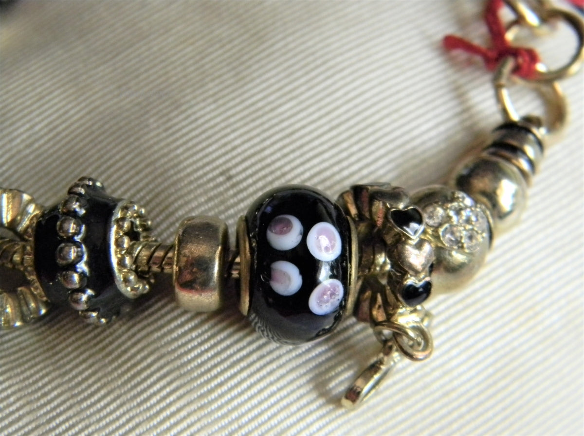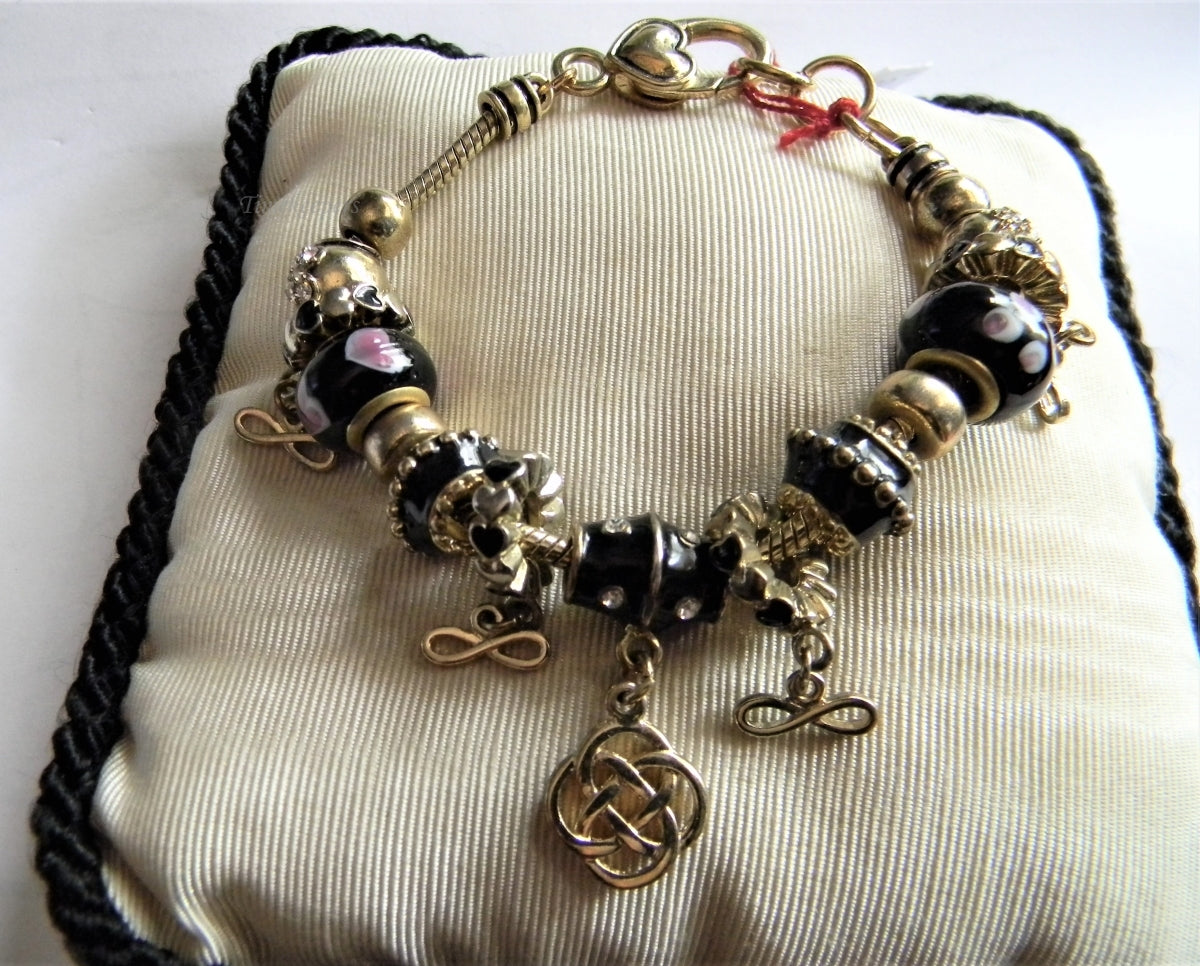 Pretty Silver tone European charm bracelet. There are 15 charms and spacers on this bracelet. The main charms are a black ceramic with designs and black enamel. Please look at the photos to verify the style and condition of this bracelet. The lobster claw clasp is heart shaped.