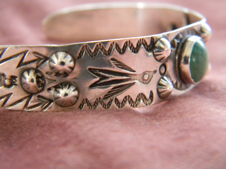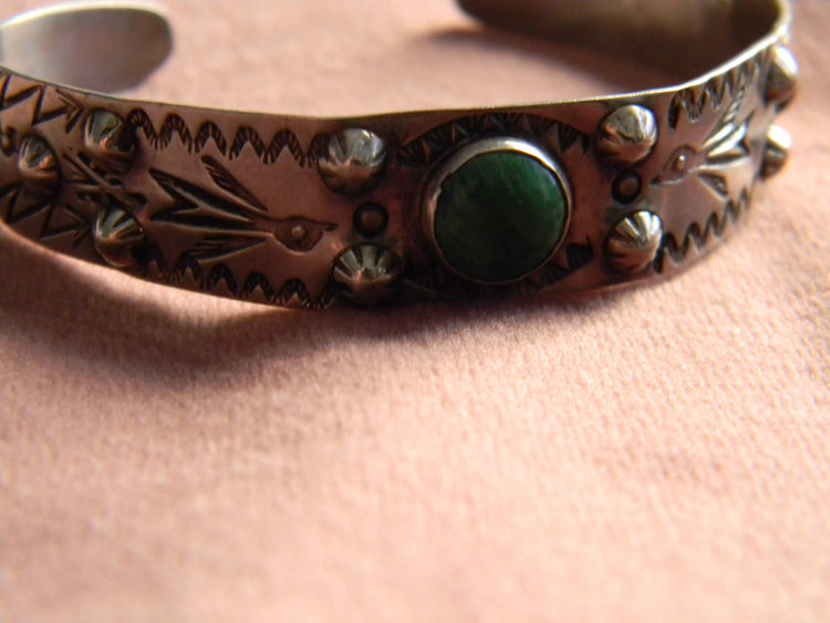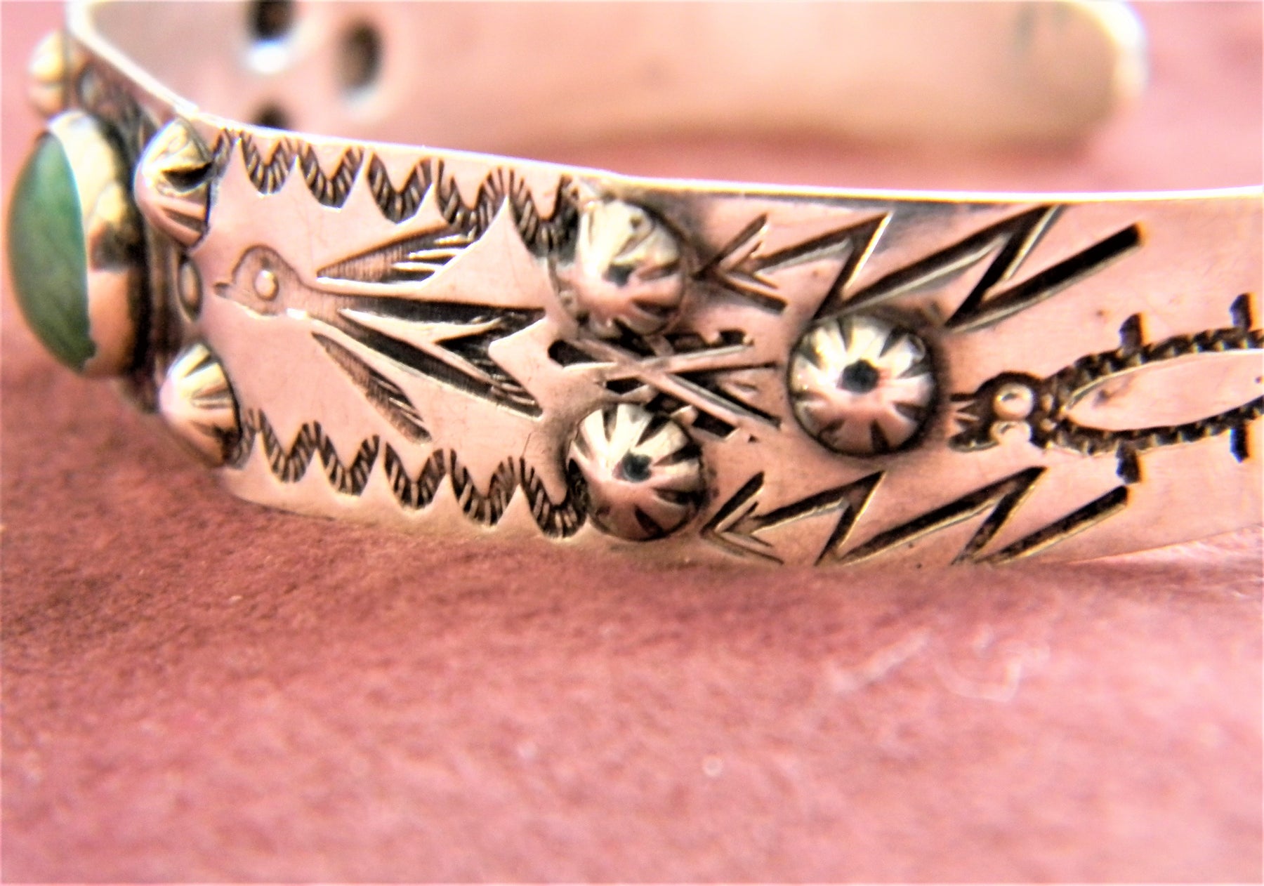Vintage Mexico Sterling Silver Cuff Bracelet, it's in good condition for it's age. This beautiful cuff bracelet features a round malachite in the center with embossed sun and other markings. This bracelet does not have any markings but has tested to sterling.