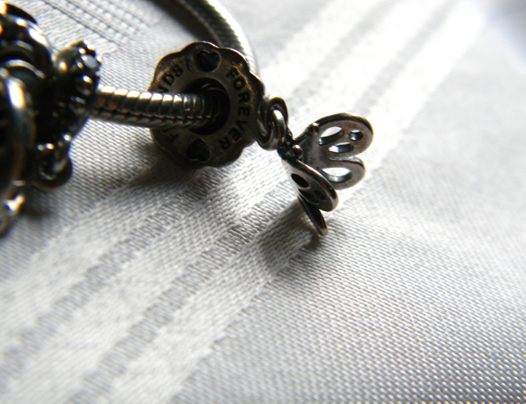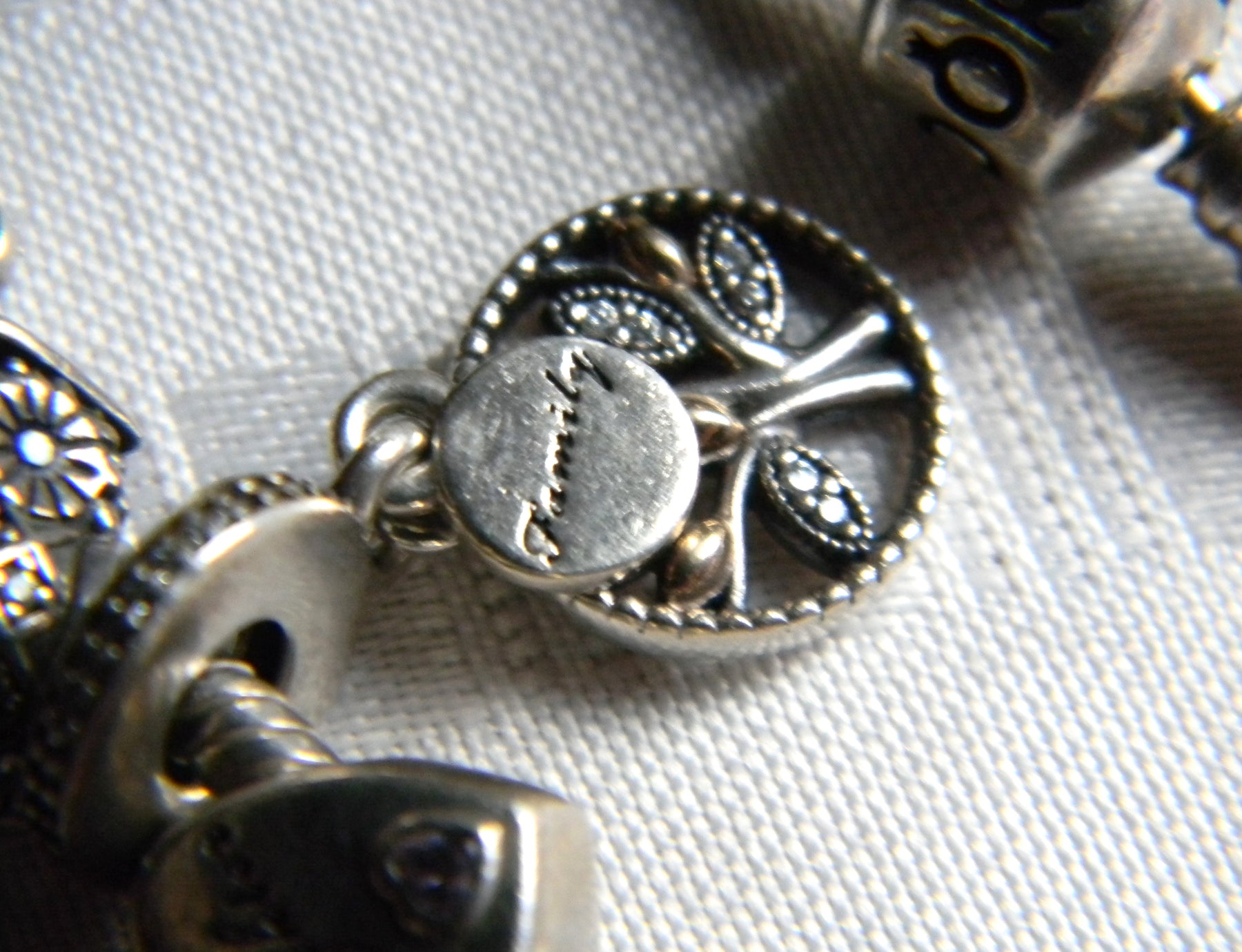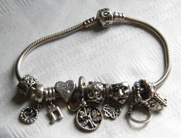 This bracelet features 10 charms, Pandora, Butterfly Forever Friends, a Tiara, Theater Mask To be or Not to be, Flower charm, Owl Graduate cham, Heart Daughter charm, Music note charm, 21 charm, Filgree charm.