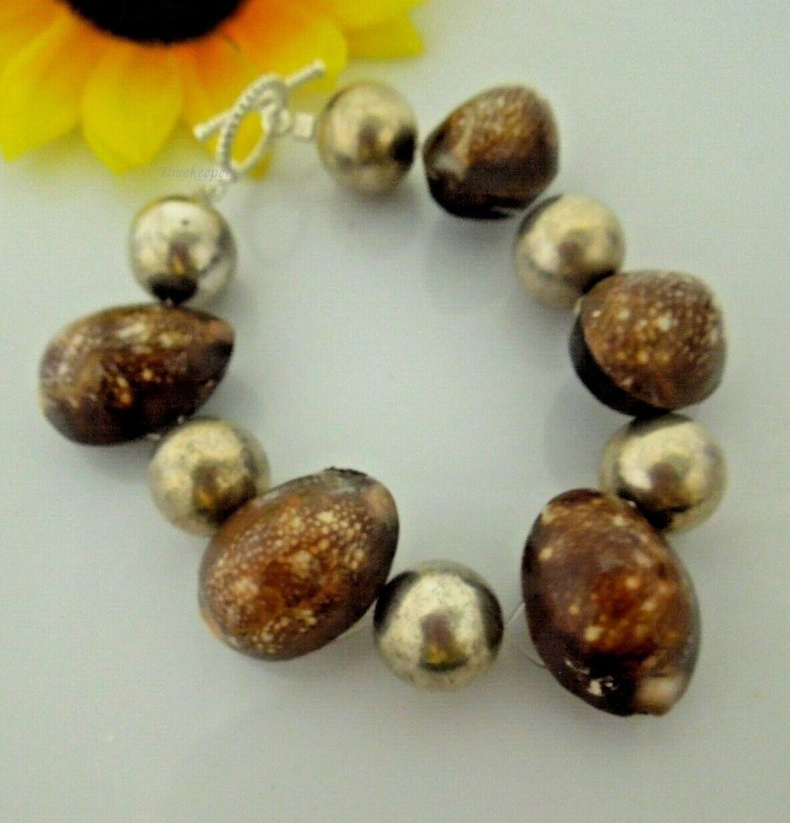 r824 Vintage Handmade Brown White Shell Wood Mounted SS Balls Bracelet Toggle Closure