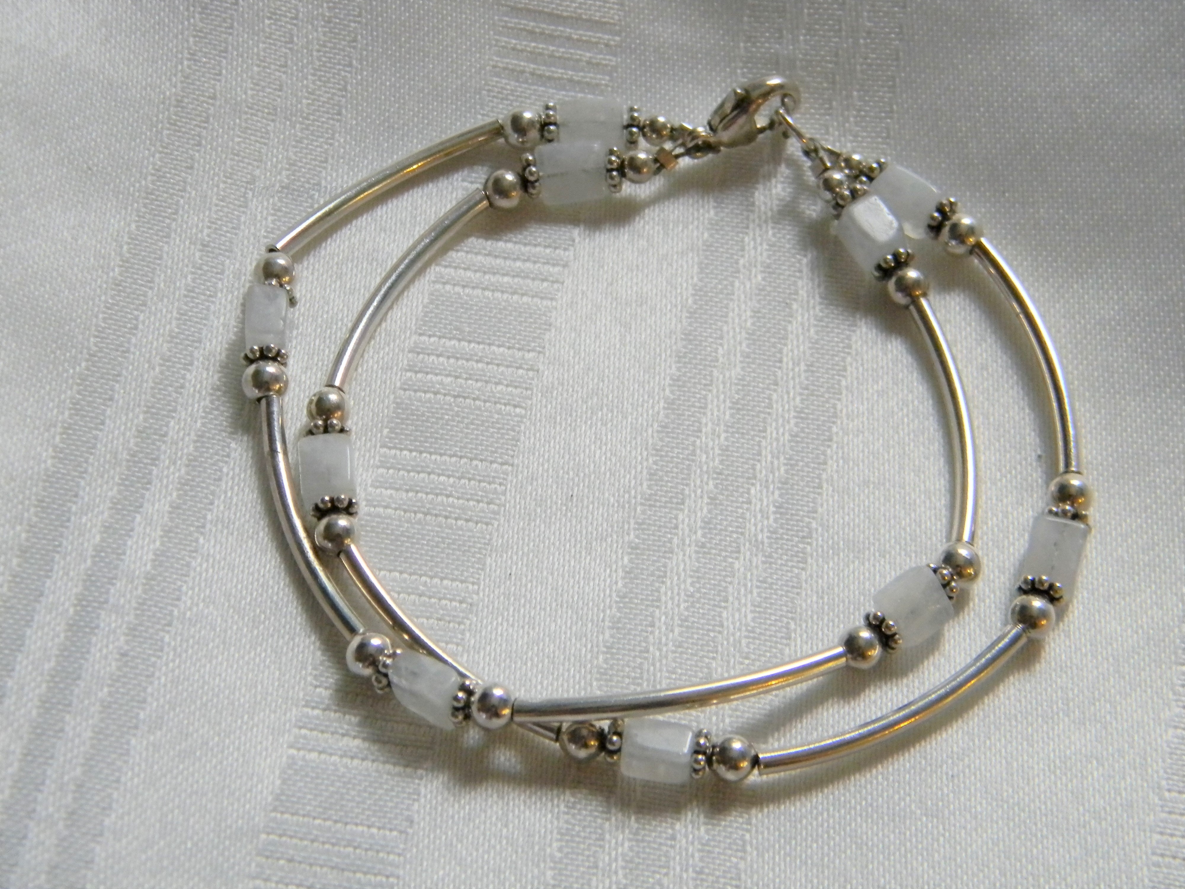 h420 Beautiful Beaded Two Strand Sterling Silver Bracelet with White Stones