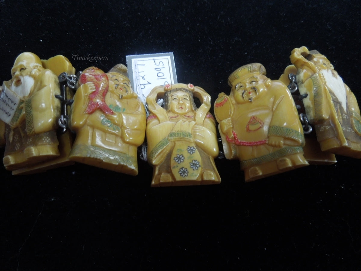 q217 Vintage Japanese Silver Carved Seven Lucky Gods Bracelet 9"