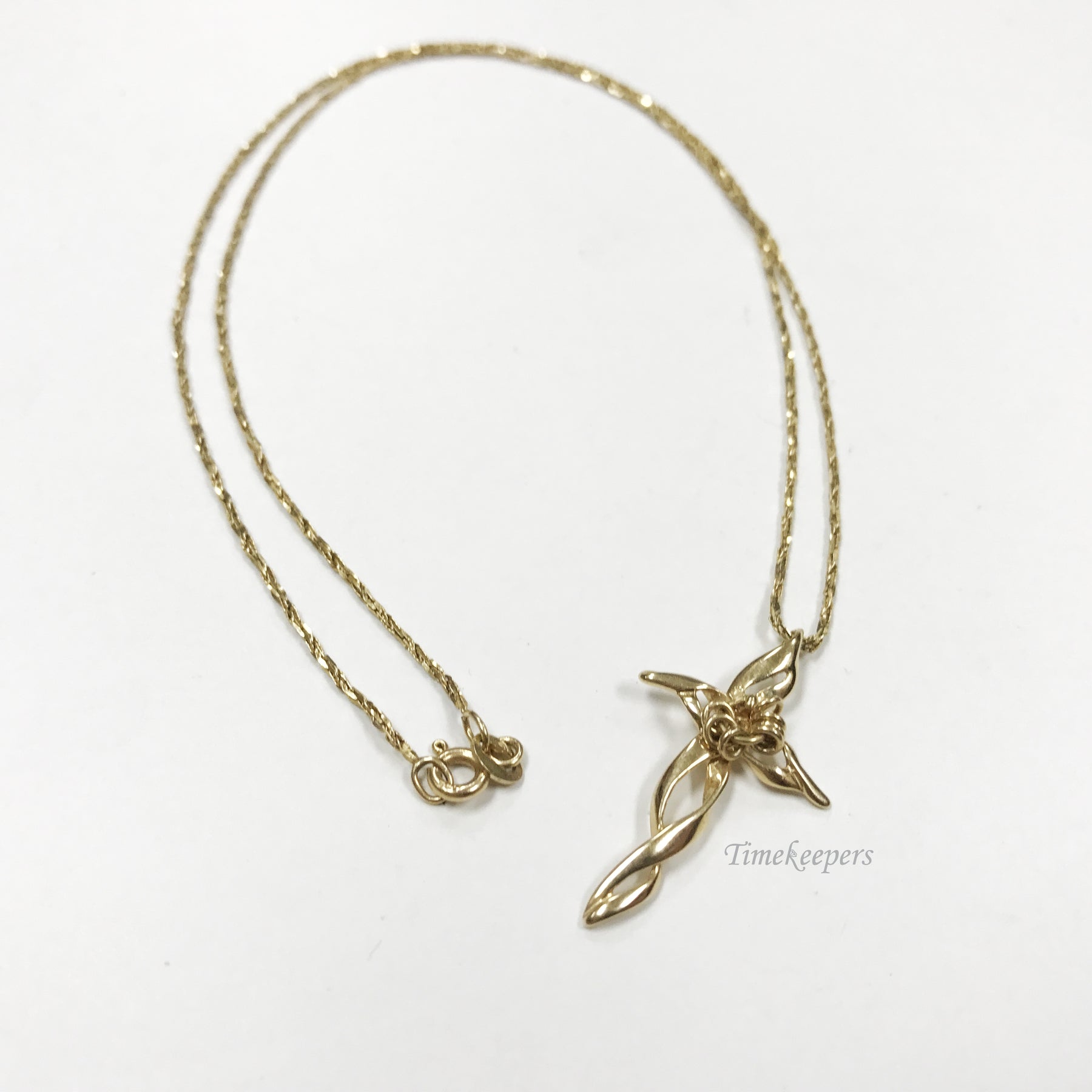 This lovely cross features two ribbons of gold entwined with each other forming the cross. The center features 7 gold rings hanging from a center ring. The back of the cross is stamped 14k. The clasp of the chain is stamped 14k Italy.