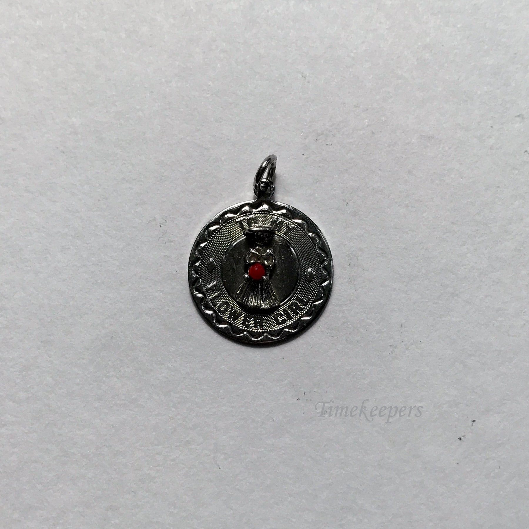 • Sterling silver(stamped) charm pendant. Round. "To my flower girl" and figure of a girl on front