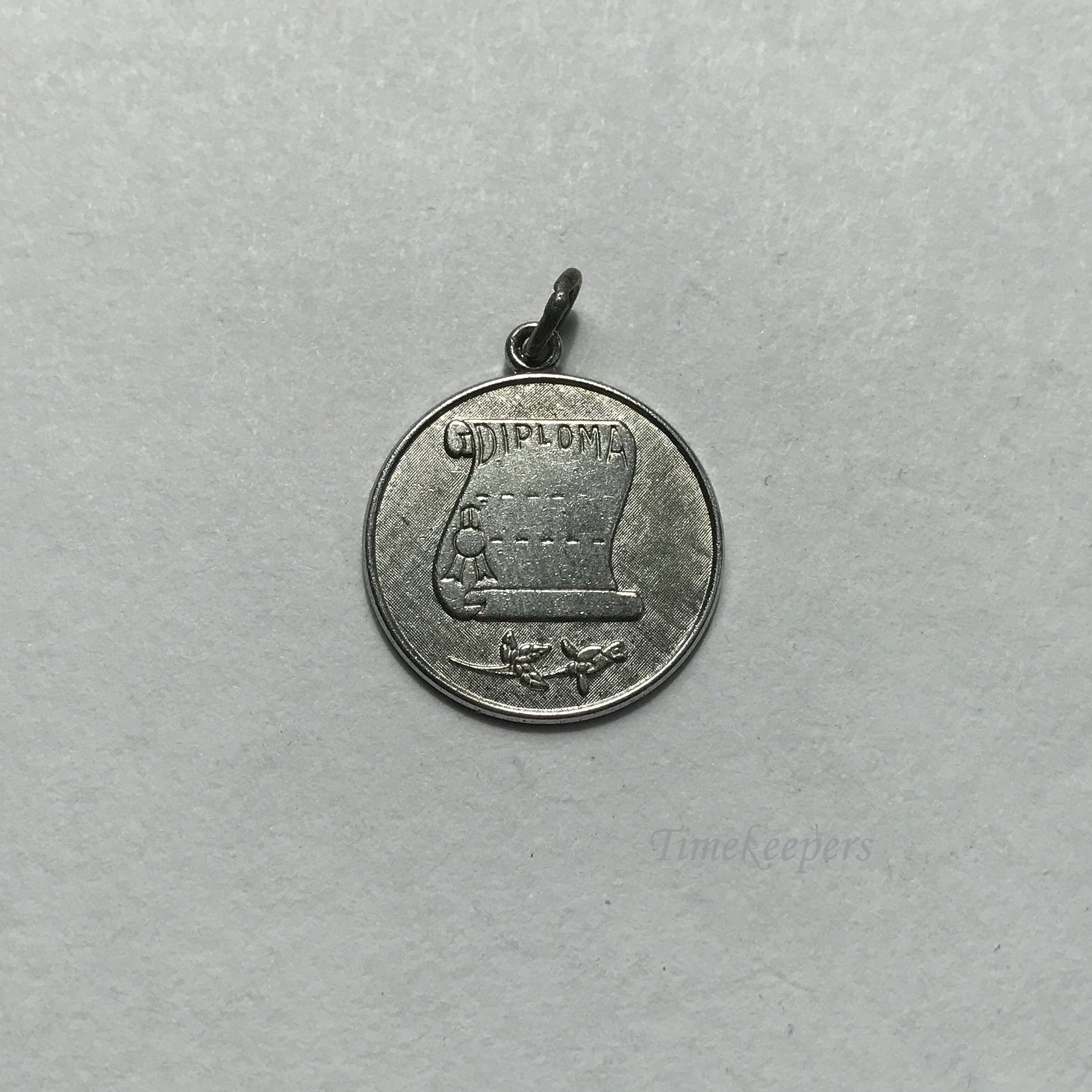 - Sterling silver charm pendant. Round coin shape with Diploma image on front.