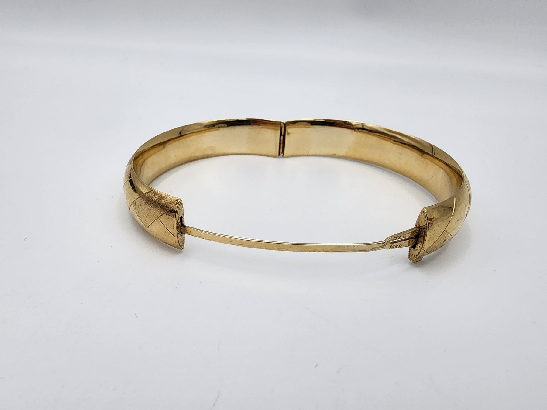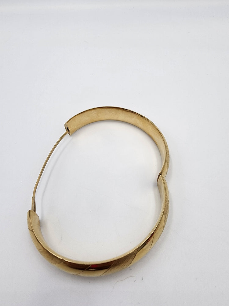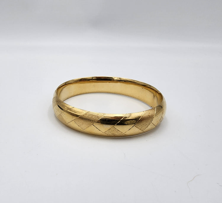 This is a beautiful braided bangle bracelet, set in 14kt yellow gold. It features a brushed and smooth "braided" finish going all around the bracelet. Bar inside lock is stamped 14k. Would be a nice gift for her!