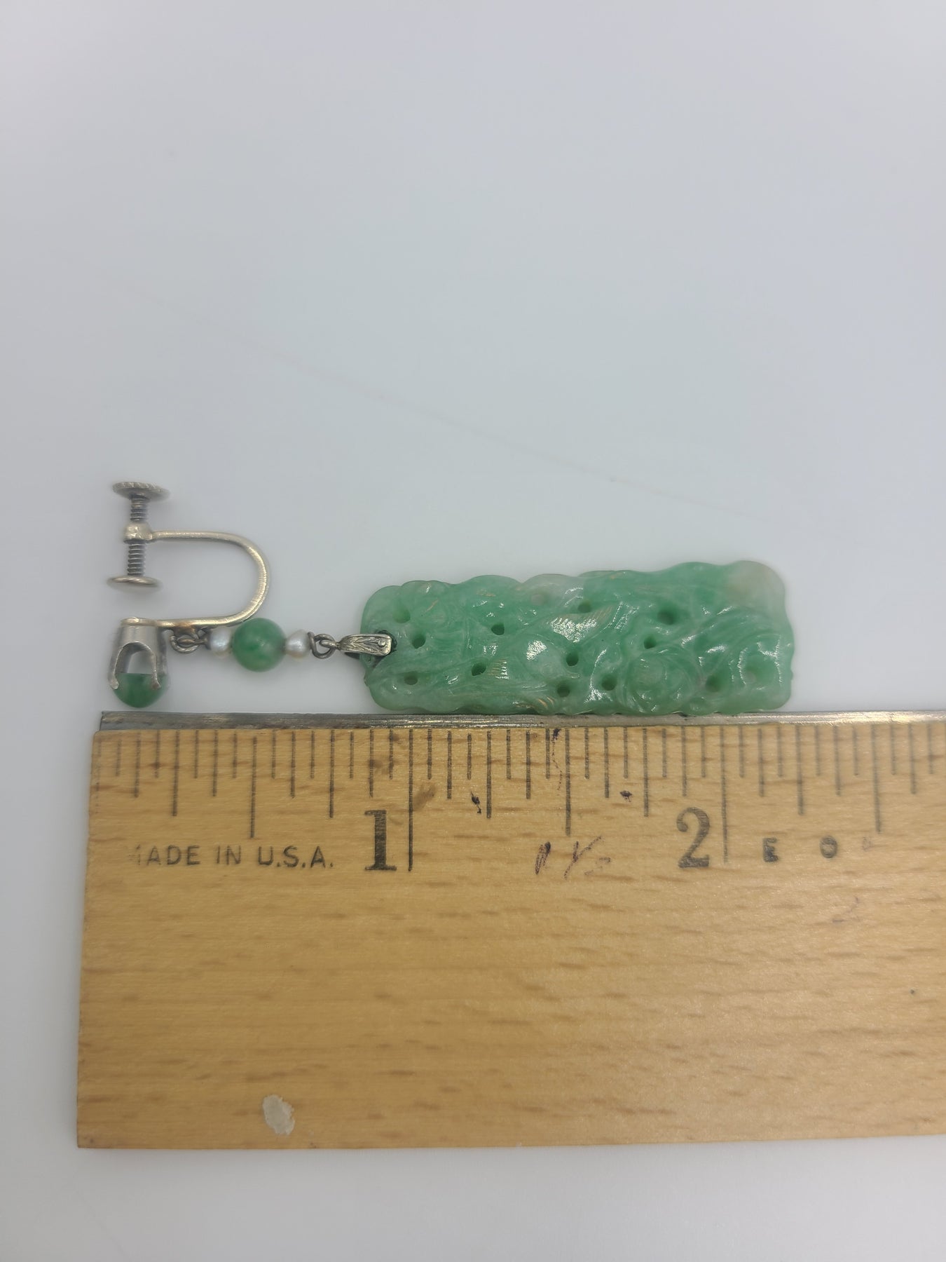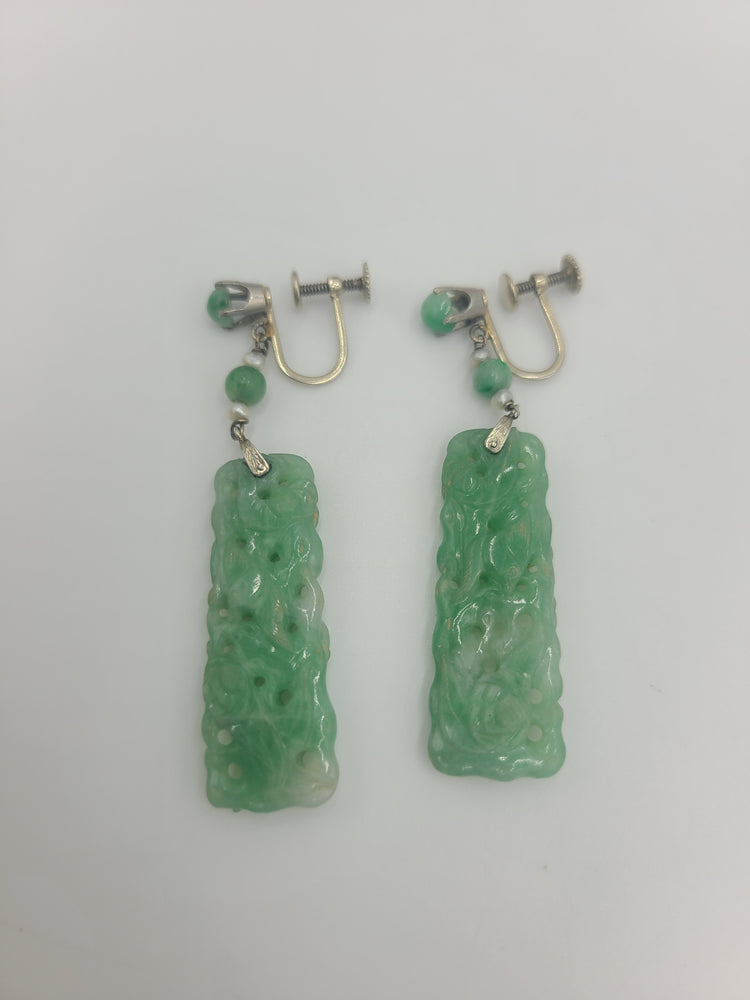 These are a lovely pair of carved rectangular Jade pieces set in 14kt white gold. Made for those with non-pierced ears. Perfect for that special occasion. Back of screw is stamped 14k. Would be a nice anniversary, birthday, Christmas, Mother's Day or Valentine's Day gift for her!