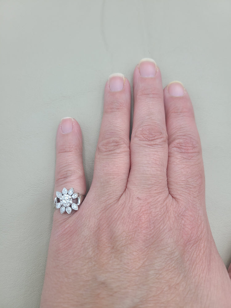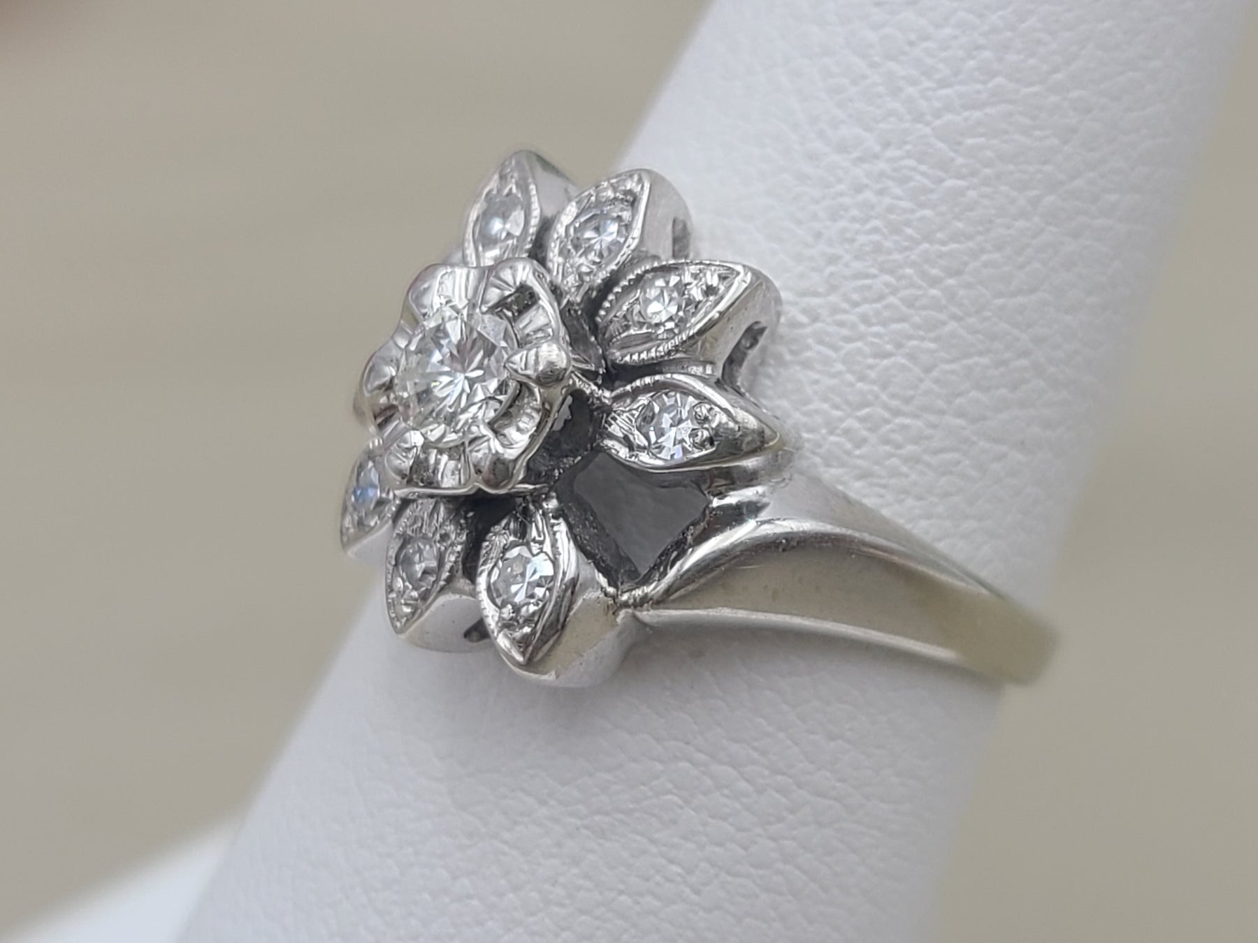 For Sale: (1) k838 Vintage Ladies 14kt White Gold Flower Style Diamond Ring