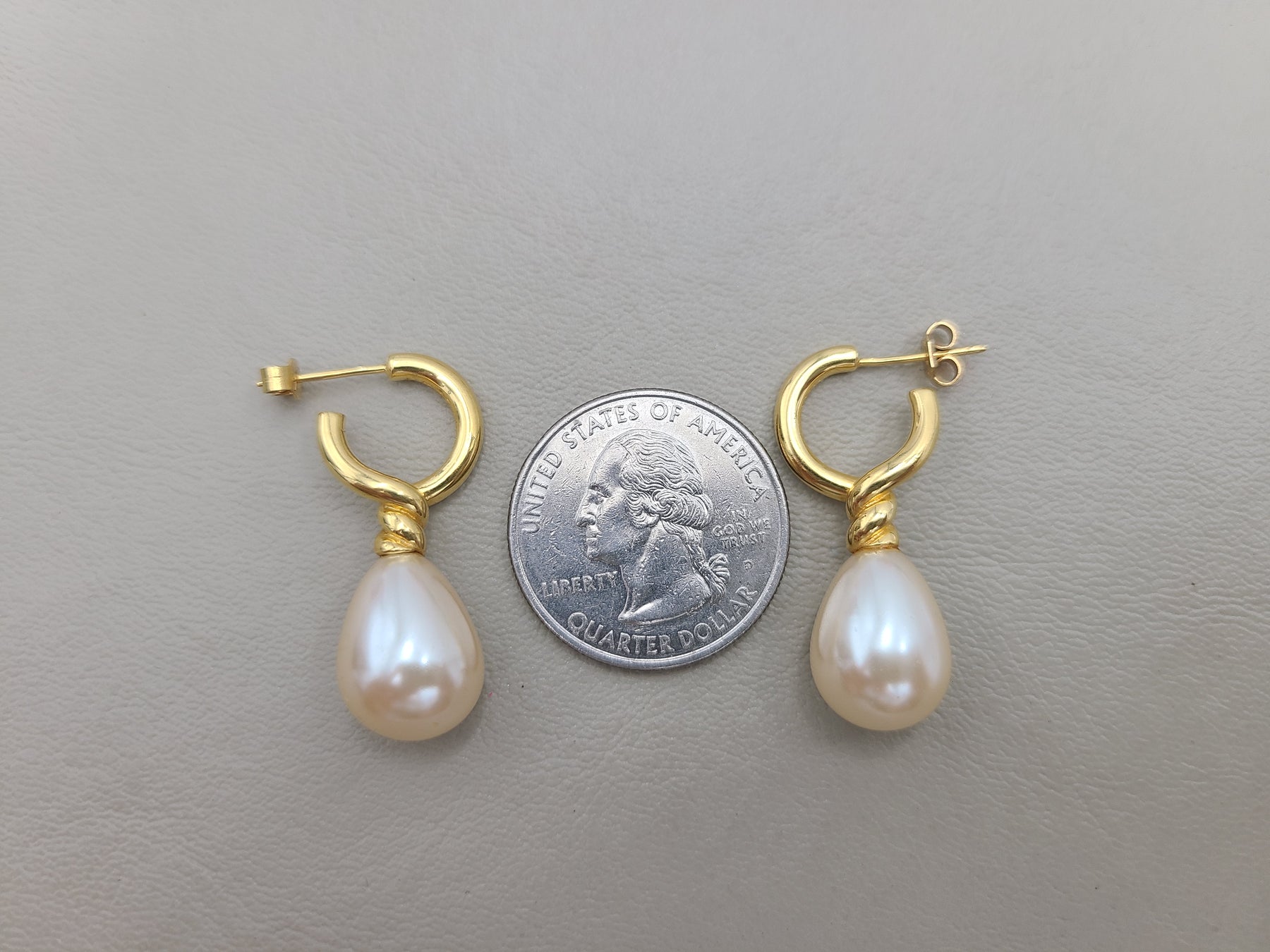 These are a lovely pair of pearl hoop earrings. They feature a large teardrop shaped pearl underneath a twisted hoop. Stamped MMA 1984 14k on the earring and the back is stamped 14k. Earrings were acid tested for gold purity. Would be a nice anniversary, birthday, Christmas, Mother's Day or Valentine's Day gift for her!