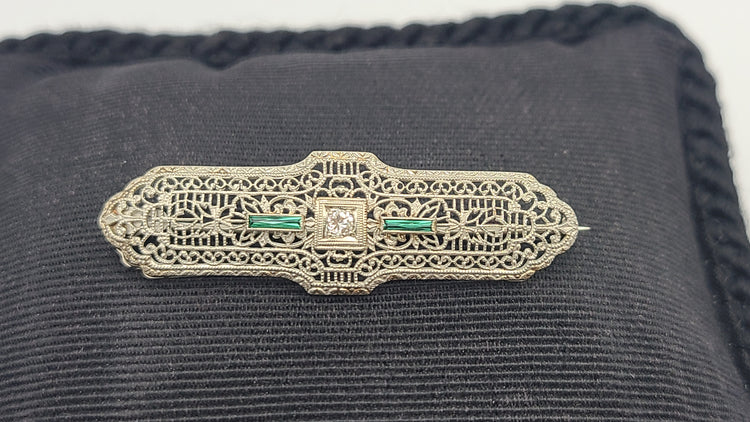 This is a lovely vintage art deco bar pin from roughly the 1920s. It features (2) two rectangular emeralds, set one on each side of the .05cts diamond nestled in the center. Latch is stamped 10k. Would be a nice gift for her!