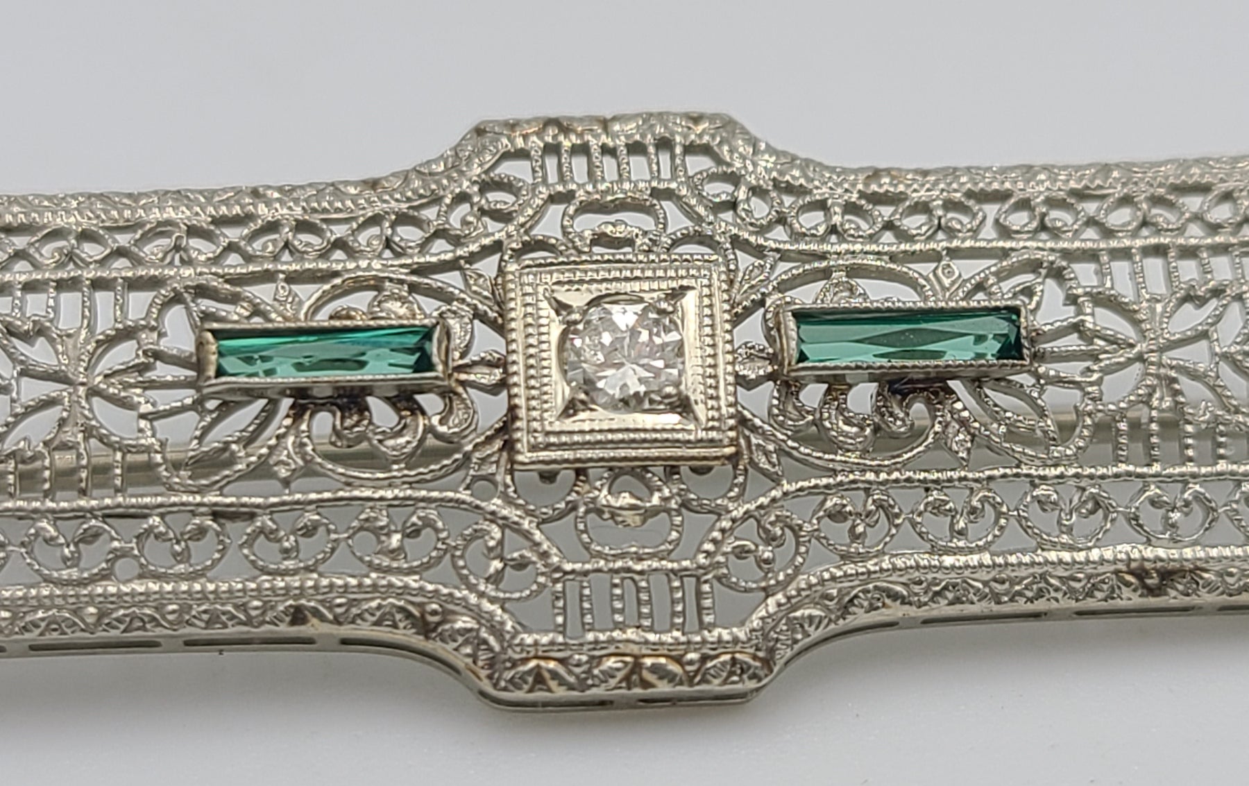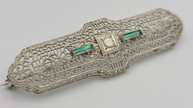 m674 Lovely Vintage 1920s Ladies Diamond and Emerald Bar Pin in 10kt White Gold
