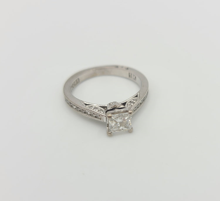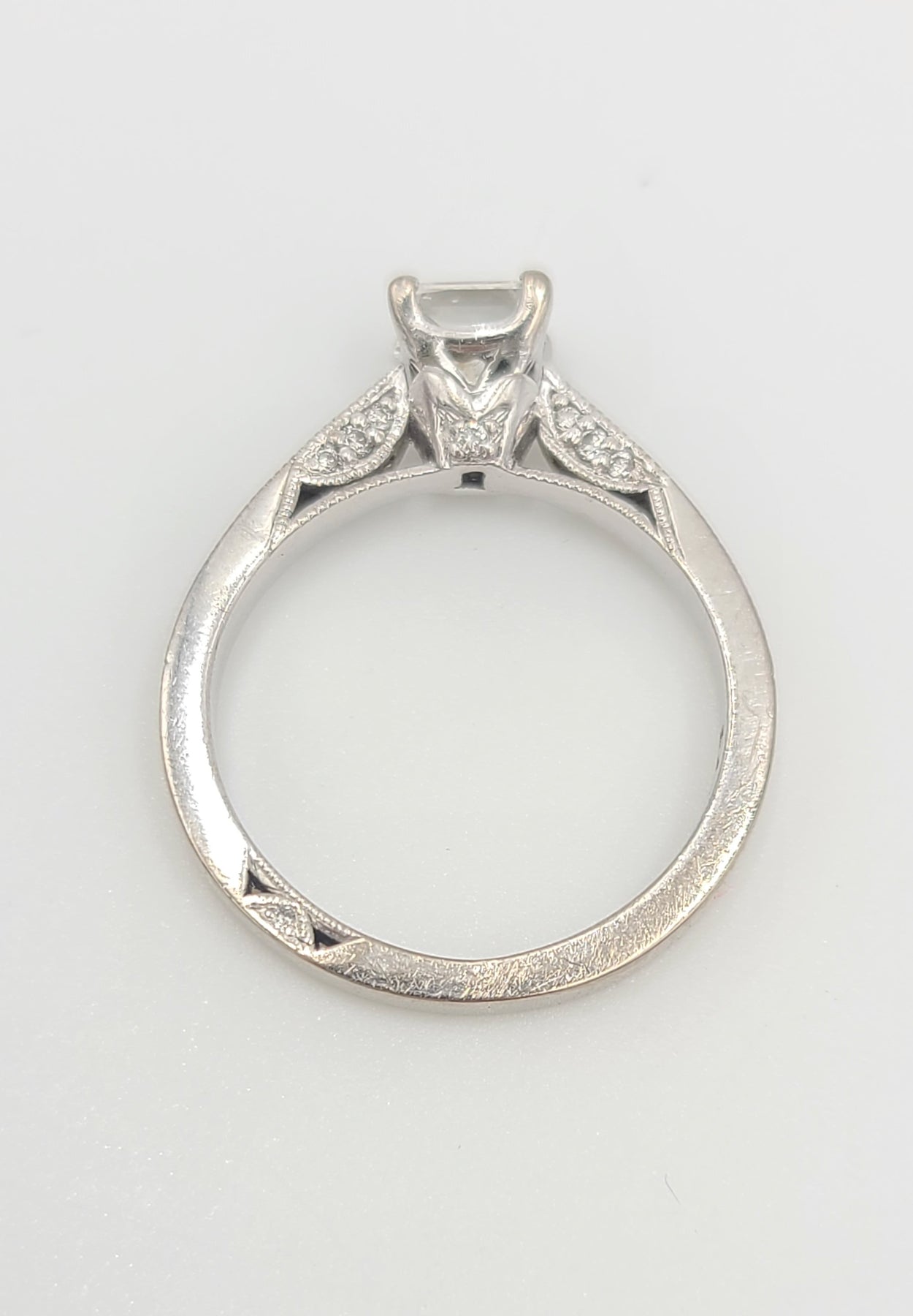 This is a lovely 18kt white gold engagement ring for her. It features a princess cut center stone and many little round diamonds going down the band, as well as on each side of the ring, and 1 on each side of the shank. As seen in photos. Inside of shank is stamped "Tacori" as well as 18k. Would be a nice ring to propose to her with!