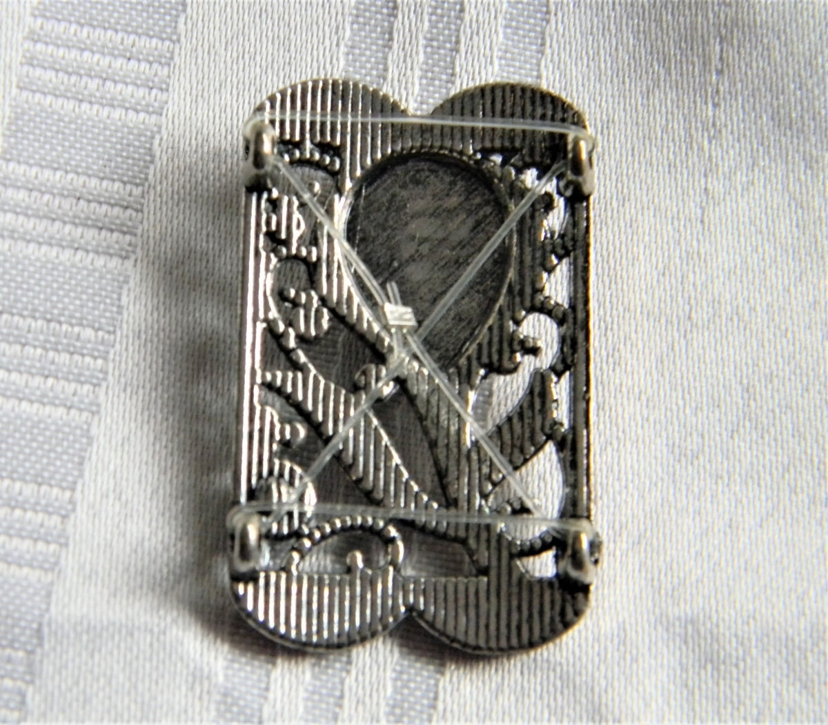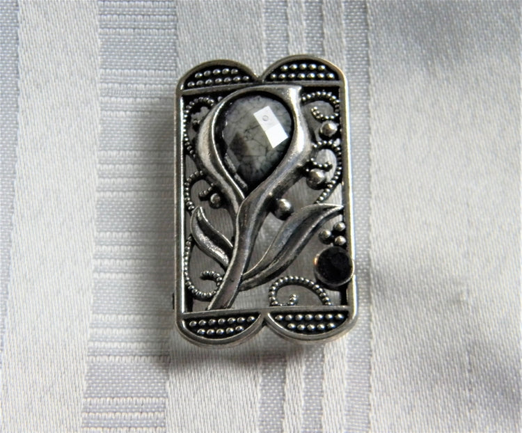 This spacer is rectangle in shape with a filigree flower design. The flower is a pear shape gray faceted stone with a small black brilliant cut stone in the corner. Could be used for various jewelry items.