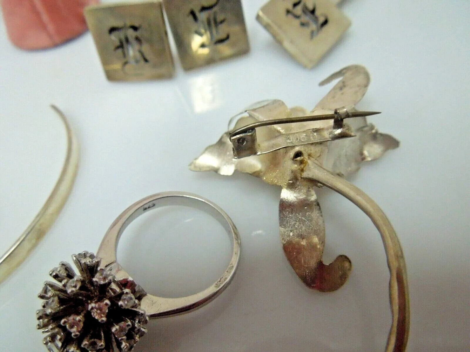 For sale: (1) r199 Lot of 10 Sterling Silver Vintage Jewelry Earrings, Rings, Brooches, Cufflinks Tie Pins, Sterling Silver Bracelet all are signed