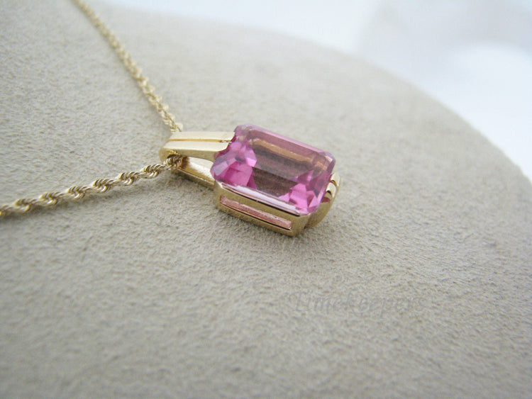This is a beautiful necklace with an emerald cut pink stone prong set in a 14k yellow gold mounting. This is hanging on a beautiful 14k yellow gold rope chain with a lobster claw clasp. The back of the pendant is stamped 14k and the necklace is also stamped 14k.