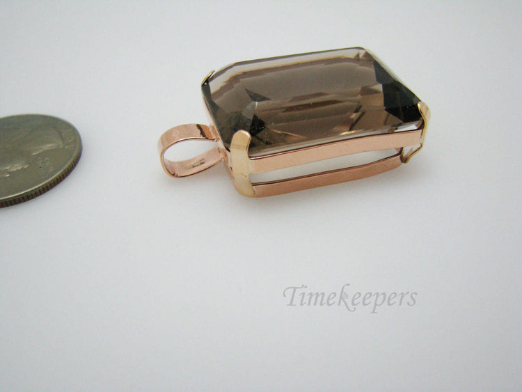 This is a beautiful radiant cut smoky quartz pendant. The four prongs are in a yellow gold with the framing and the bail in rose gold. This piece is not stamped but has been tested to 14k gold. It is simply beautiful!