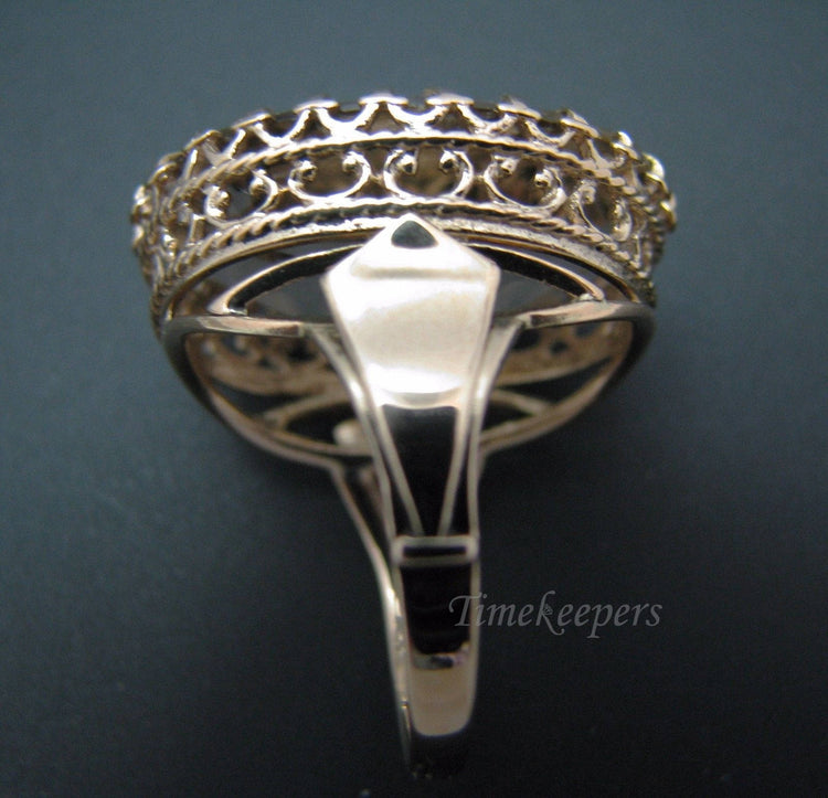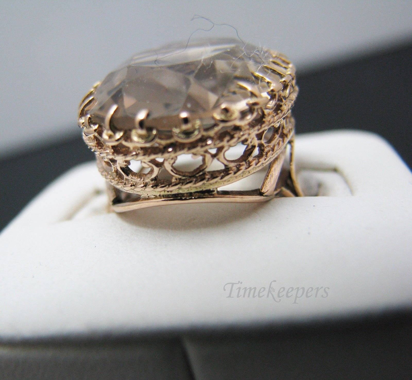 This is a lovely large oval cut smokey quartz ring in 14k yellow gold simple elegant mounting. The inside of the ring is not stamped but has been tested to 14k gold. There appears to be (3) prongs that are broken. However, the stone seems to be secure and does not move in the mounting.