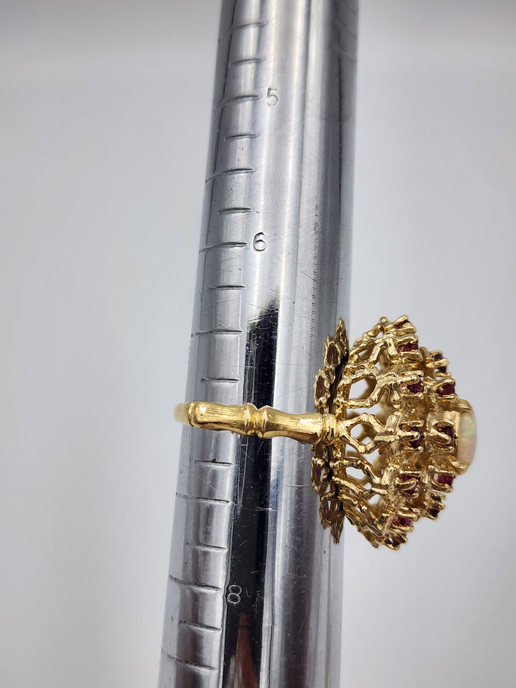 This is a stunning opal and ruby ring. It features a lovely colorful oval opal in its center, surrounded by two tiers of set ruby stones. Bamboo style band/shank. Shank is stamped 14k. Any questions, feel free to ask! =)