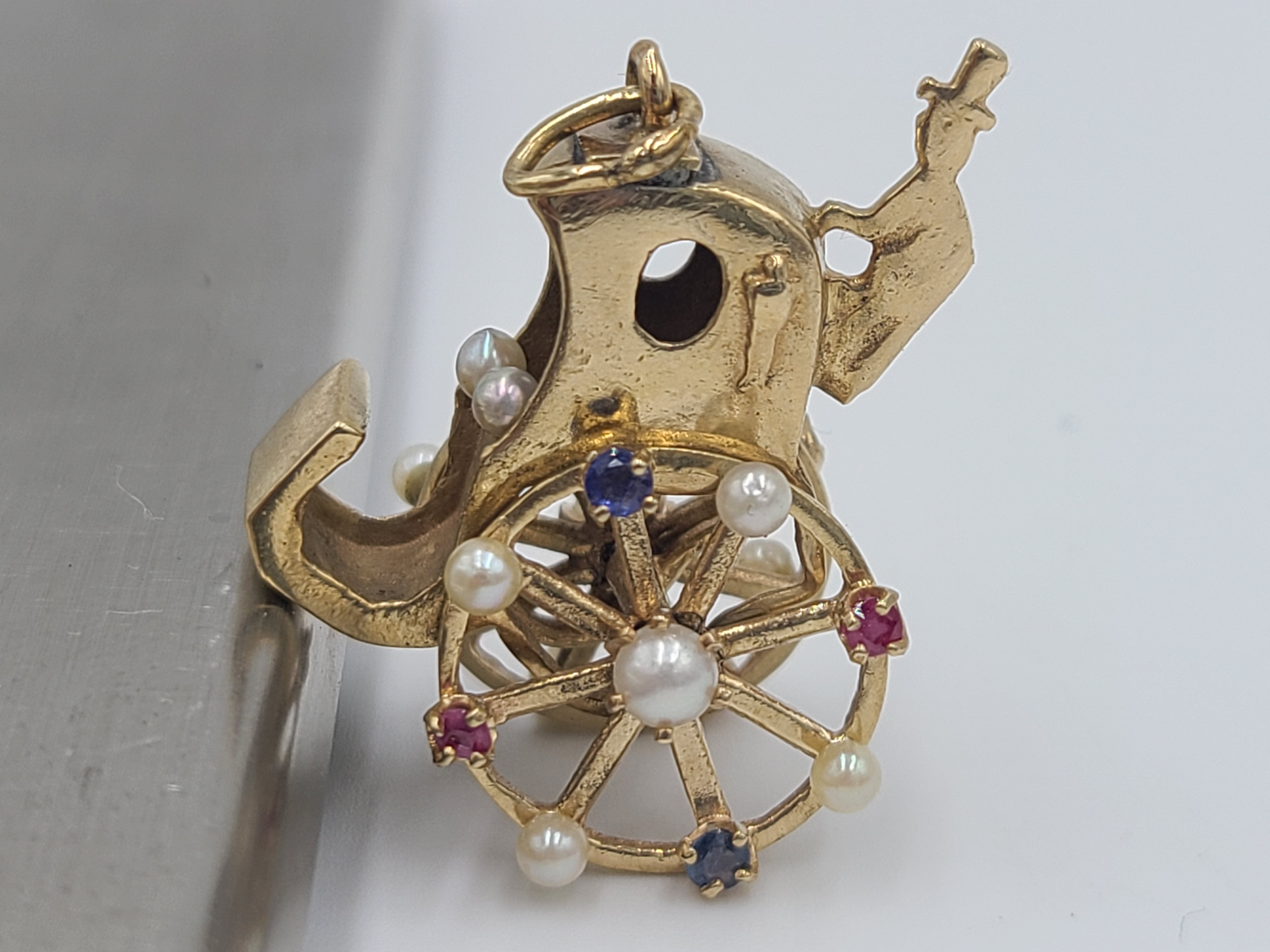 k685 Cute Vintage Ladies 14kt Yellow Gold Ruby, Sapphire and Pearl Stagecoach Charm or Pendant
