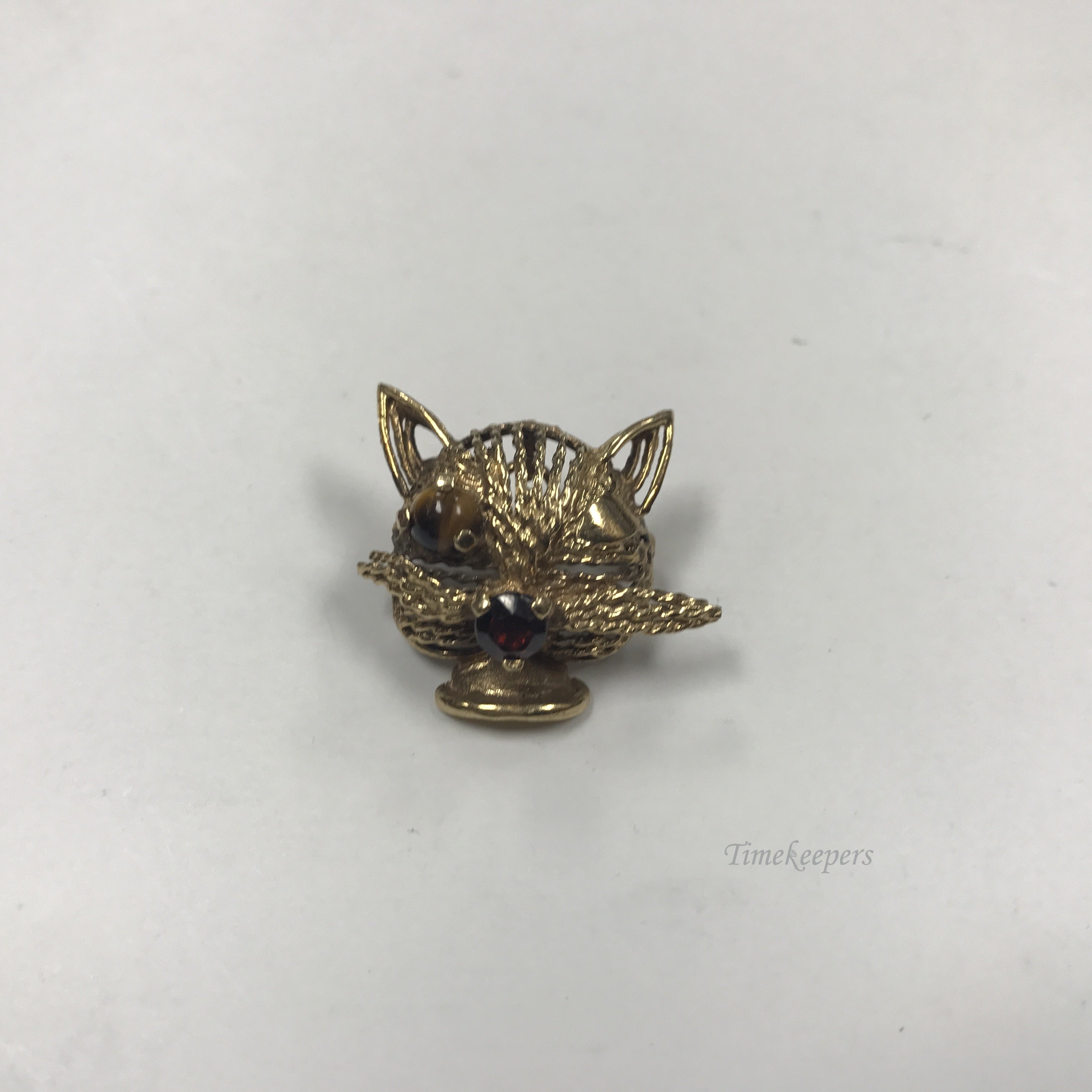 d397 Vintage Original 14K Yellow Gold Charm Pendant Brooch Cat Tiger Eye Garnet