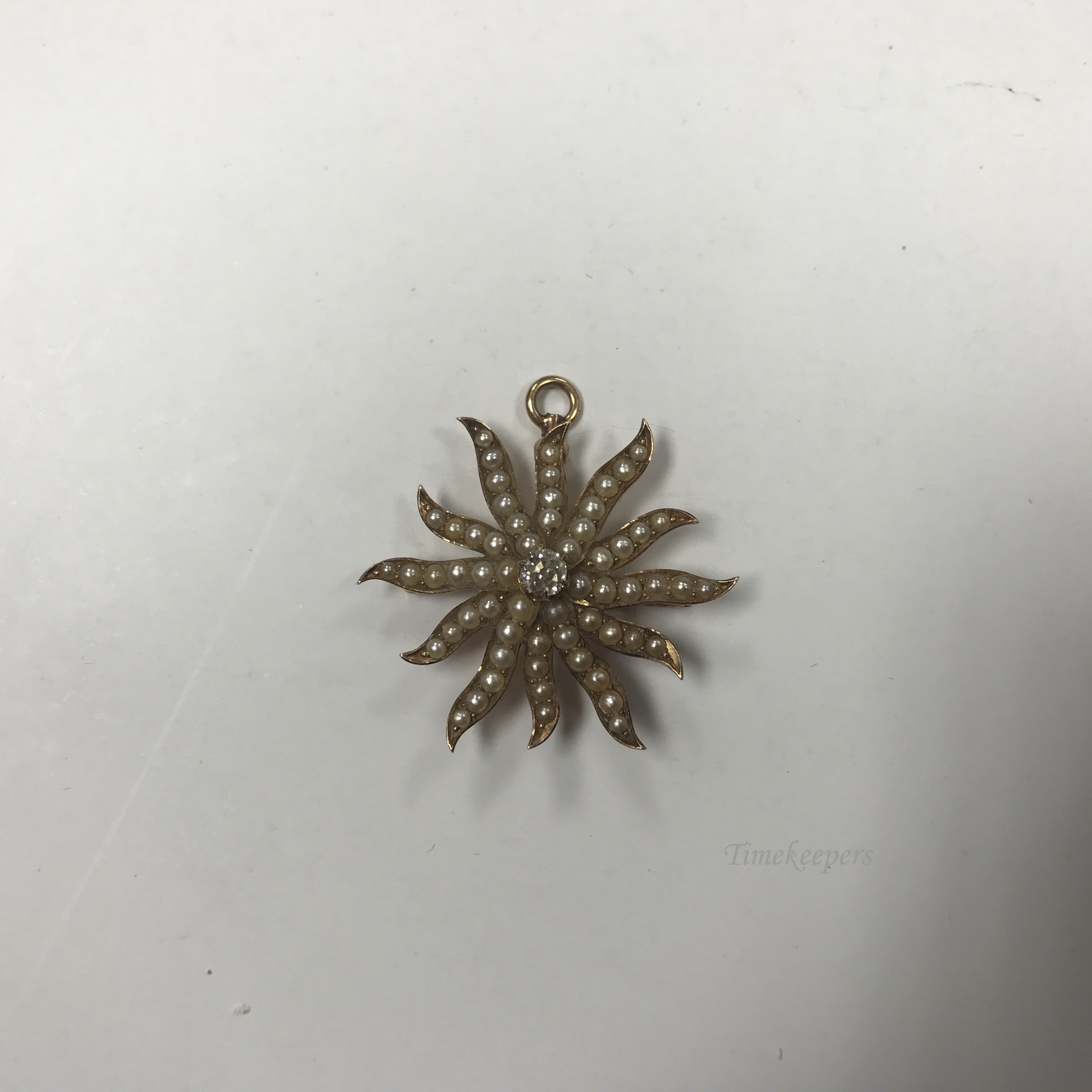 d398 Vintage 14K Yellow Gold Charm Pendant Brooch Seed Pearls Diamond .25TCW