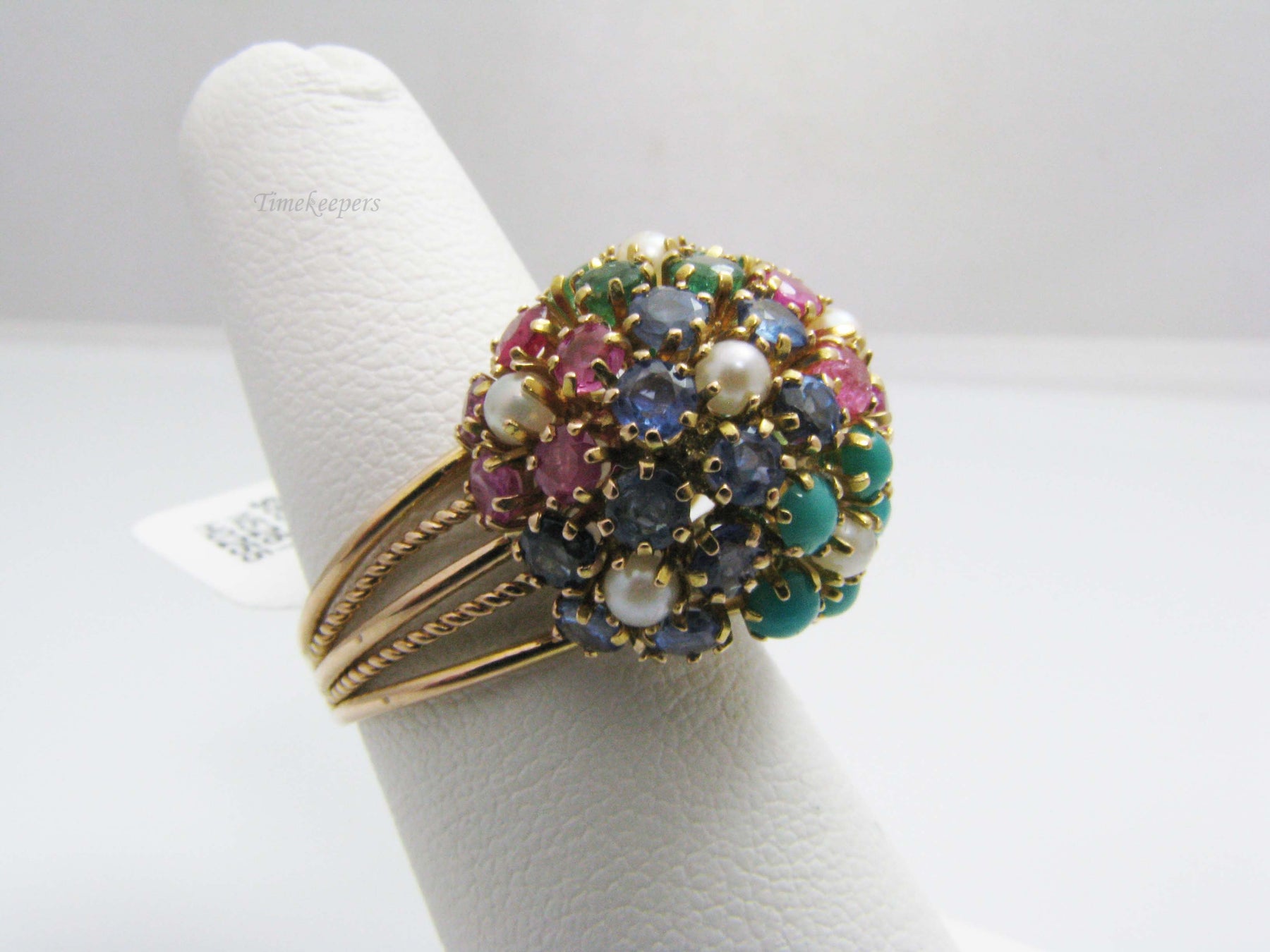 ruby, sapphire, emerald and turquoise. Ring is stamped 14 on the outside