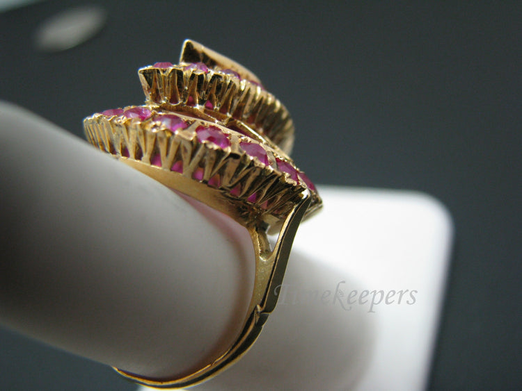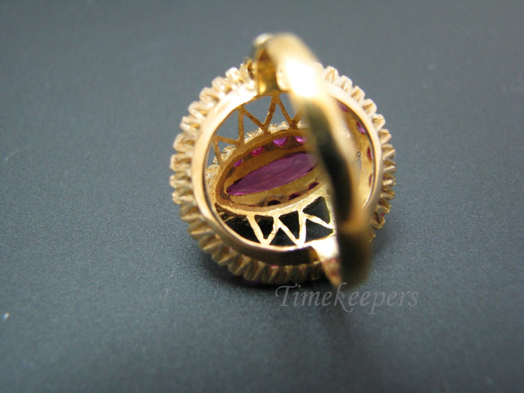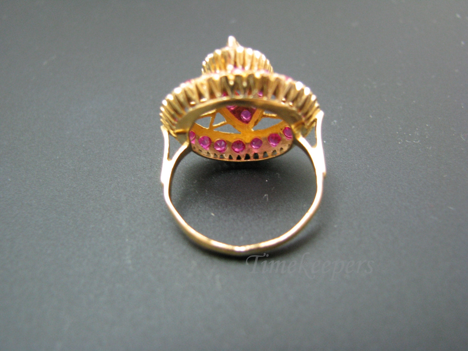 This is an absolutely stunning ring! The ring features a center marquis cut synthetic ruby 12.10 mm x 5.27 mm surrounded by (14) 2.5 mm brilliant cut synthetic rubies shaped in a marquis that is raised above the rest of the ring. Below the marquis shapes you have a round circle approximately 21.10 mm across with (21) 2.7 mm synthetic rubies edging the circle. The band is not stamped but this ring tested to 18 karat yellow gold. This is a truly unique ring!