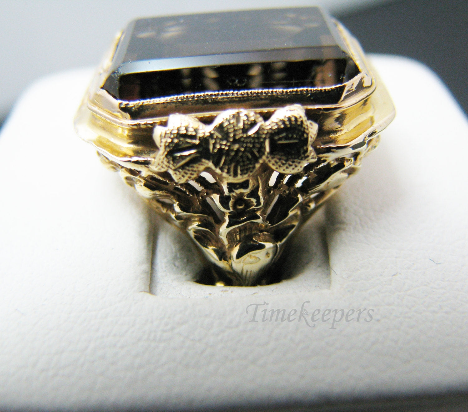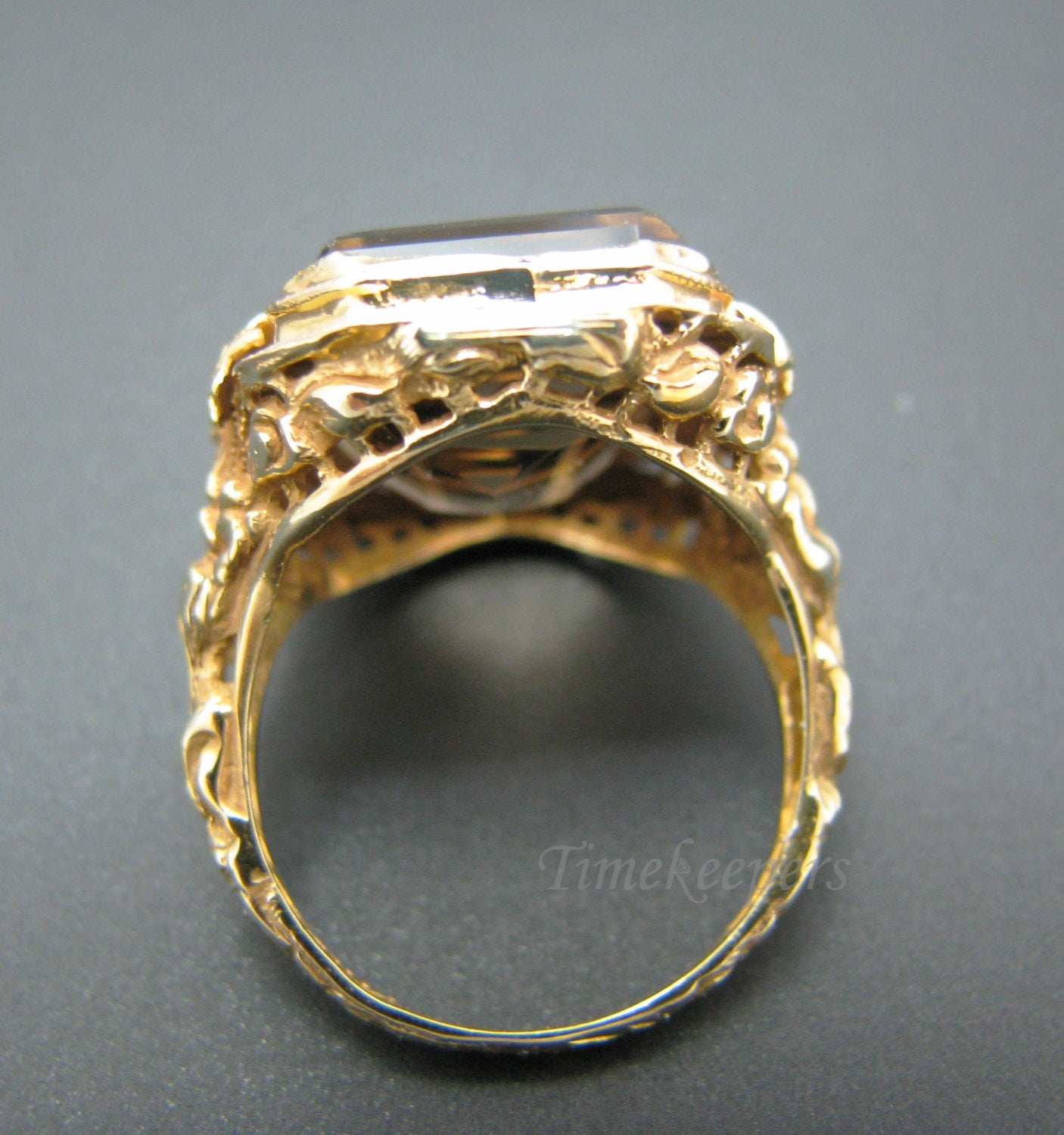This is a lovely emerald cut smokey quartz ring in 14k yellow gold filigree mounting with bows on each side. The embossed filigree design does cover the whole ring band. This ring is stamped 14k.
