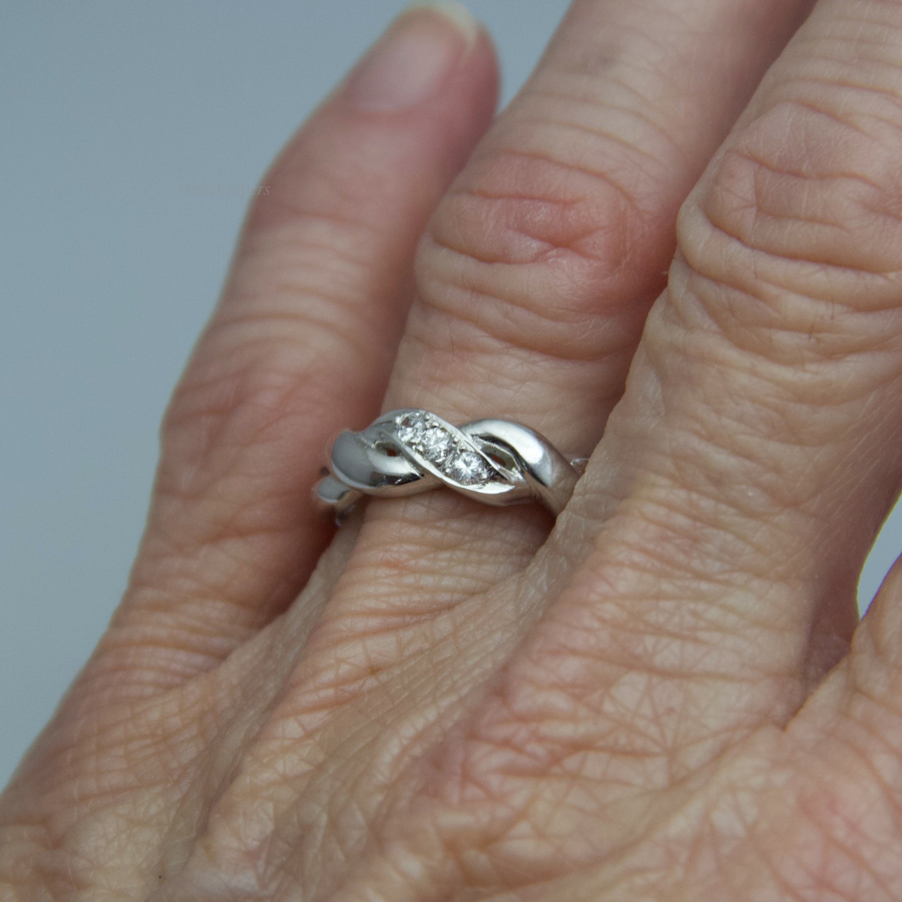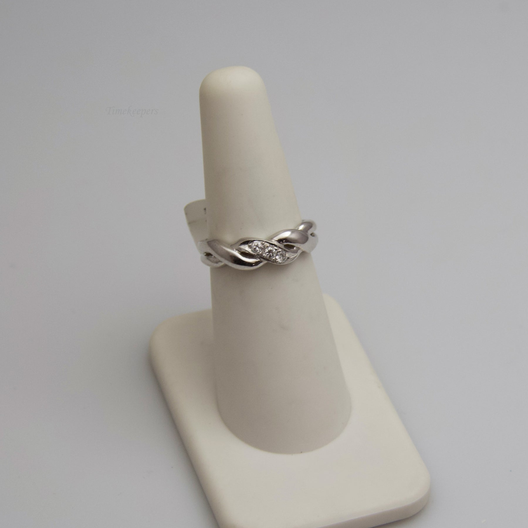 This white gold diamond ring is gorgeous in its subtlety. It contains three (3) diamonds, who are beautifully accentuated by the wrapping style of the ring’s band.