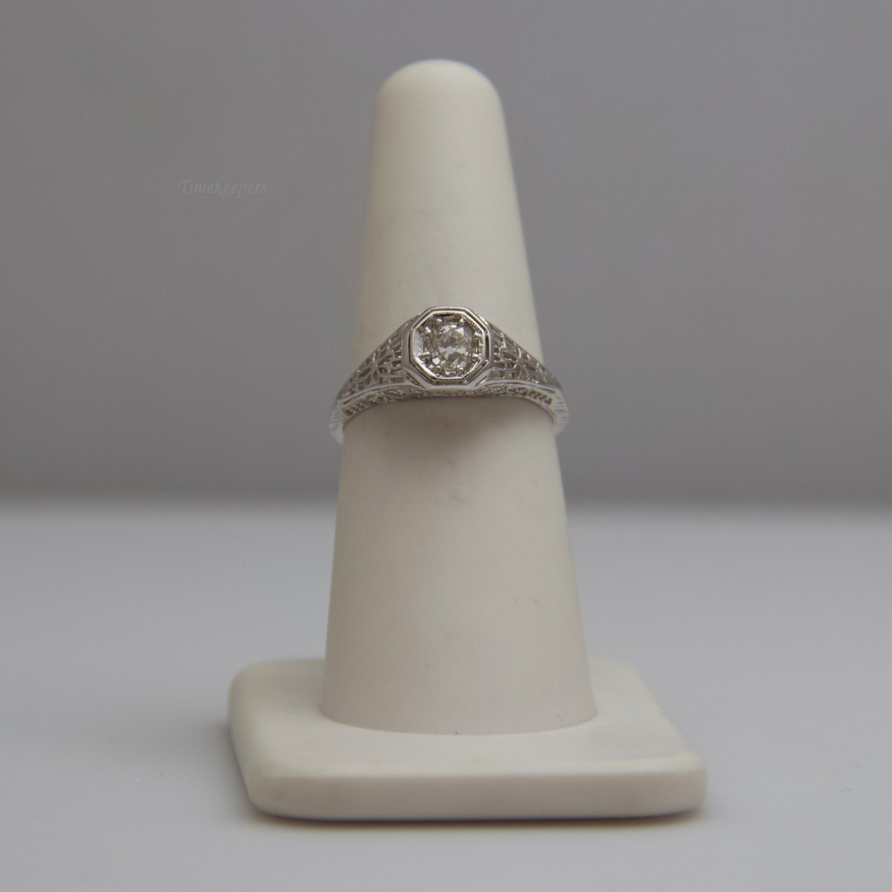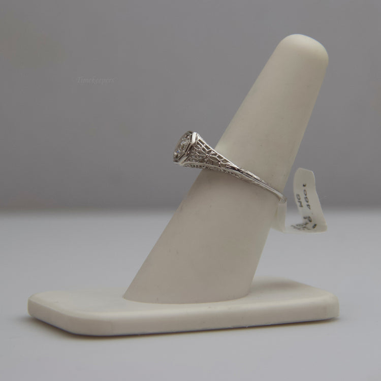 This white gold diamond ring is incredibly detailed. It contains one (1) large diamond that is highlighted by the careful band detailing surrounding it. This ring is not stamped, but has been tested for authenticity.