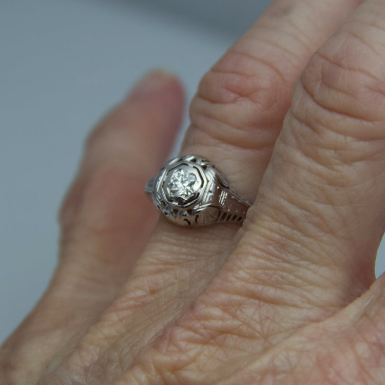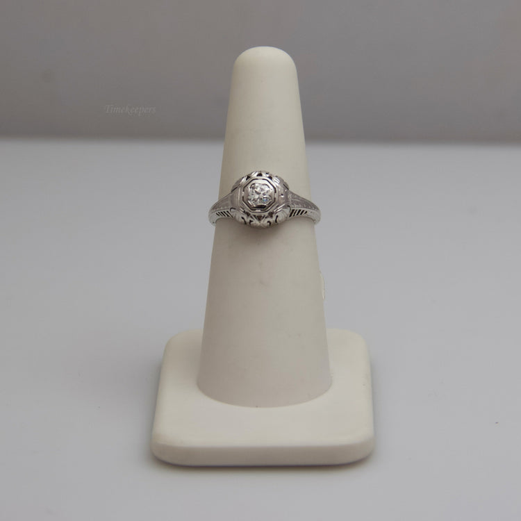 This white gold diamond ring is incredibly detailed. It contains one (1) large, eye-catching diamond that is highlighted by the careful band detailing surrounding it. This ring is not stamped, but has been tested for authenticity.