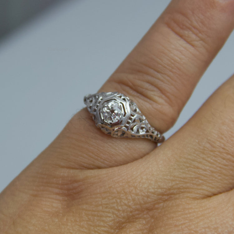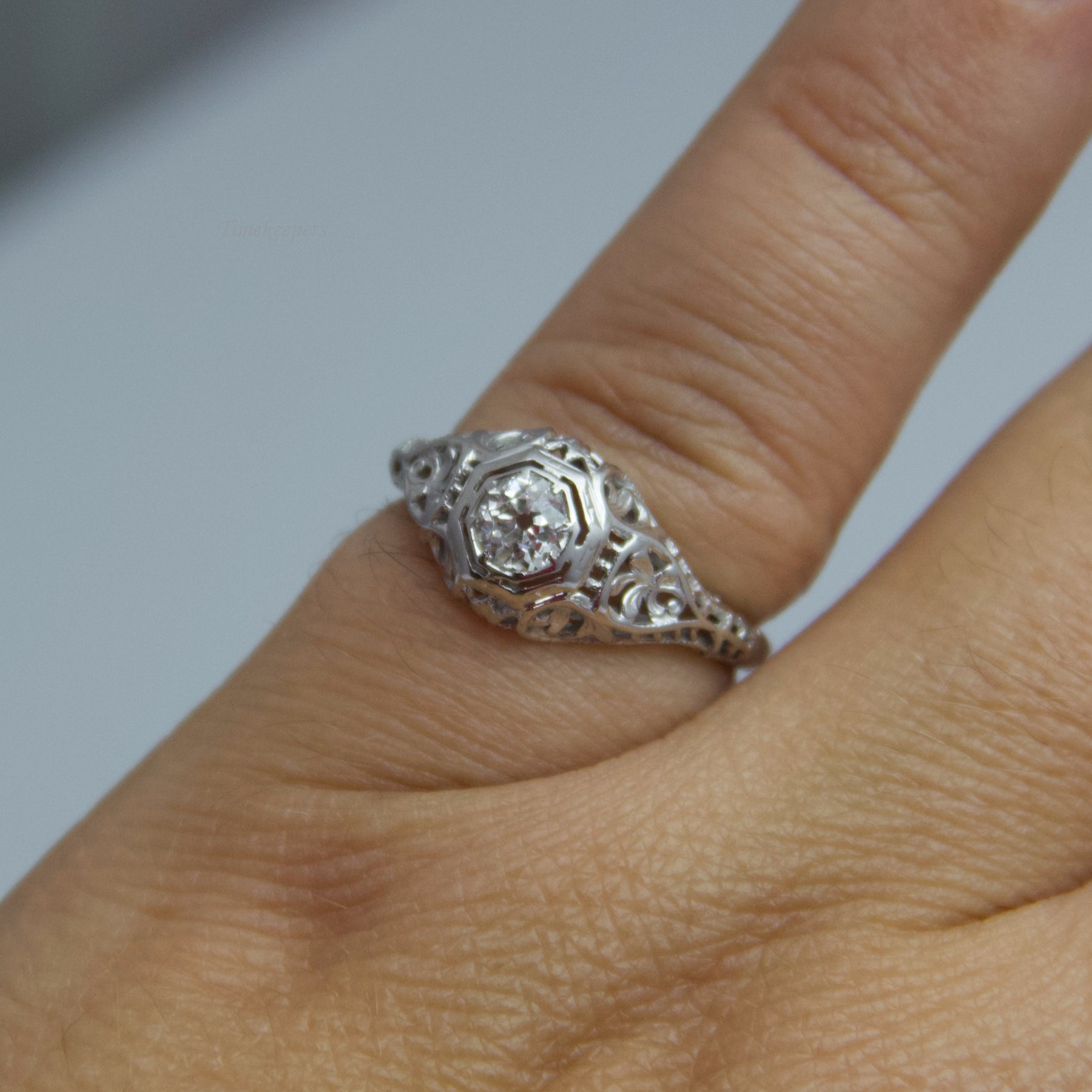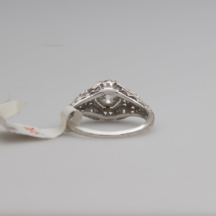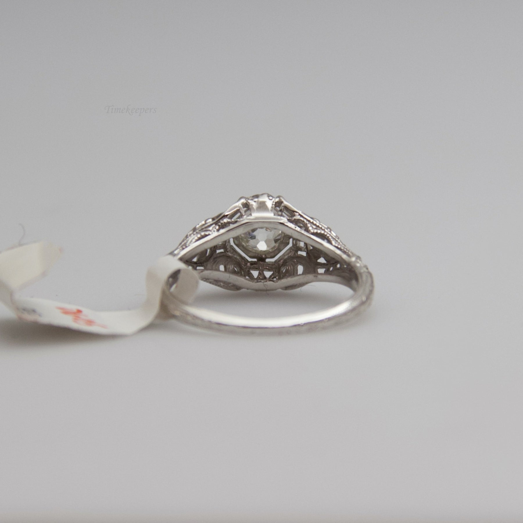 This white gold diamond ring contains one large diamond, which is accentuated by the delicate details in the band.