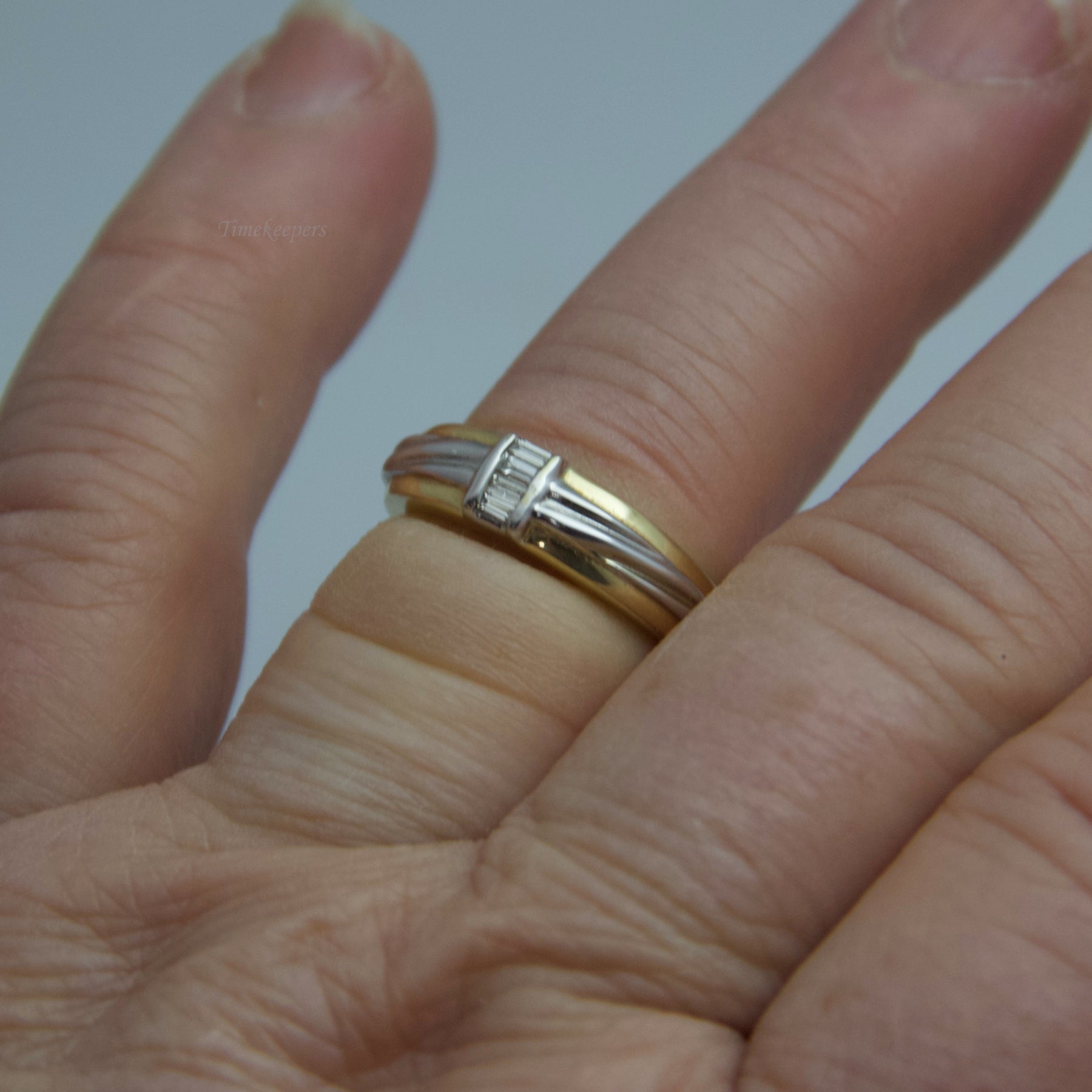 This ring contains four (4) diamonds, all of which are baguette cut. The two tone (white gold & yellow gold) band accentuates the diamonds beautifully.