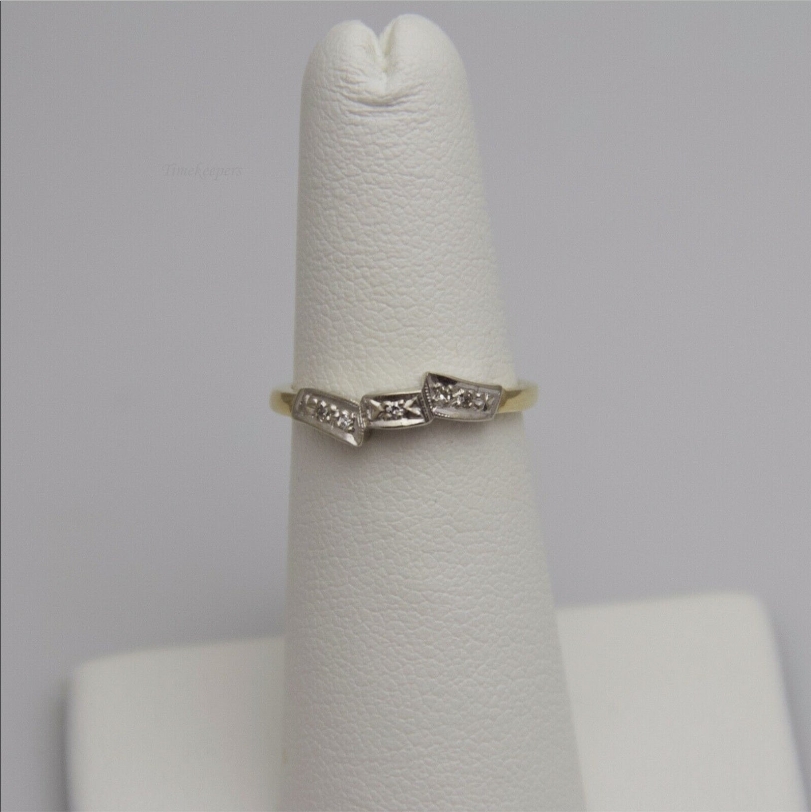 This ring contains five (5) diamonds, all of which are round cut. They are accentuated beautifully by the unique gold band.