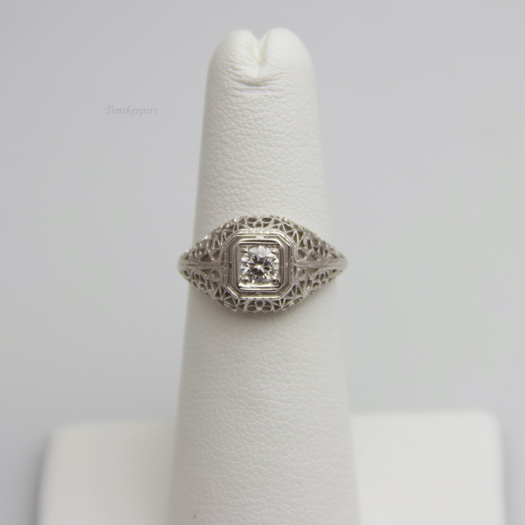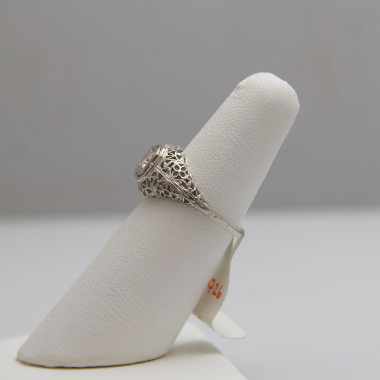 This ring contains one large diamond (round cut) which is accentuated by the fine filigree detailing in the band.