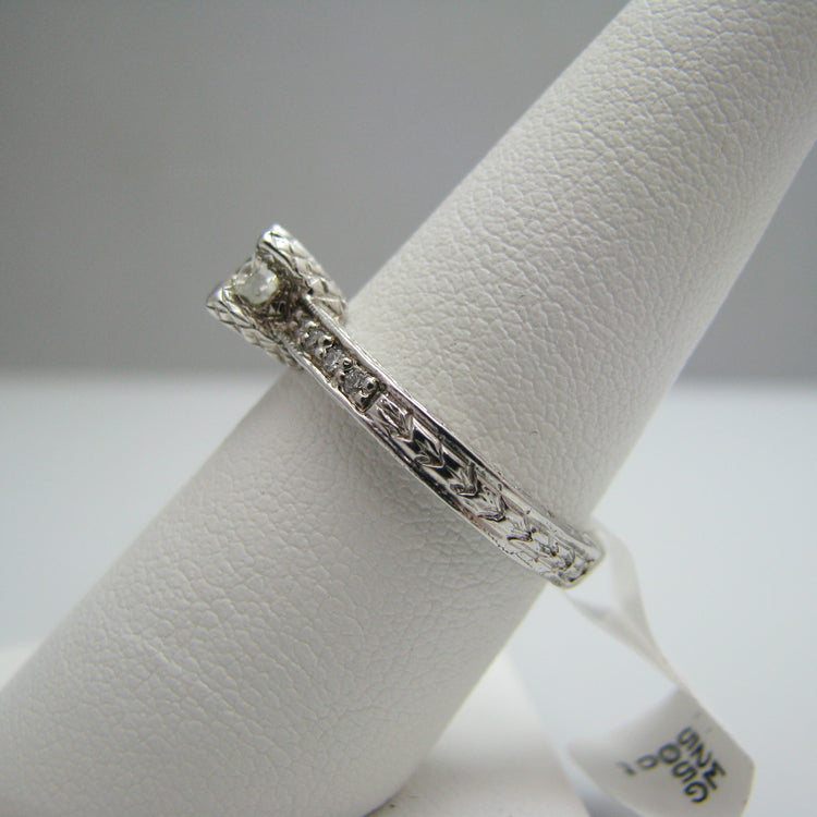 This ring contains nine (9) diamonds, all of which are round cut. They are accentuated by the detailing in the band. This ring is stamped.