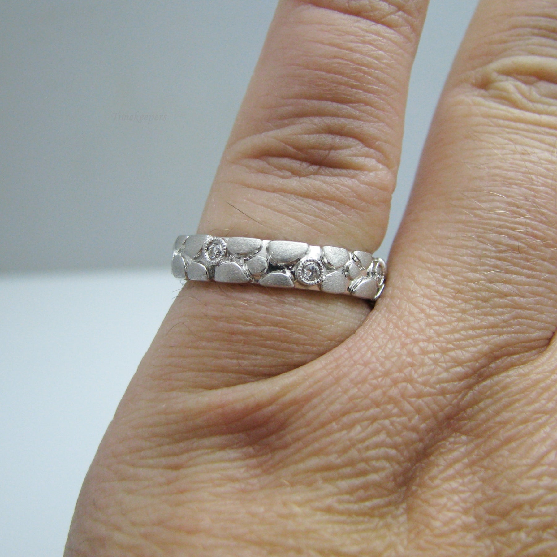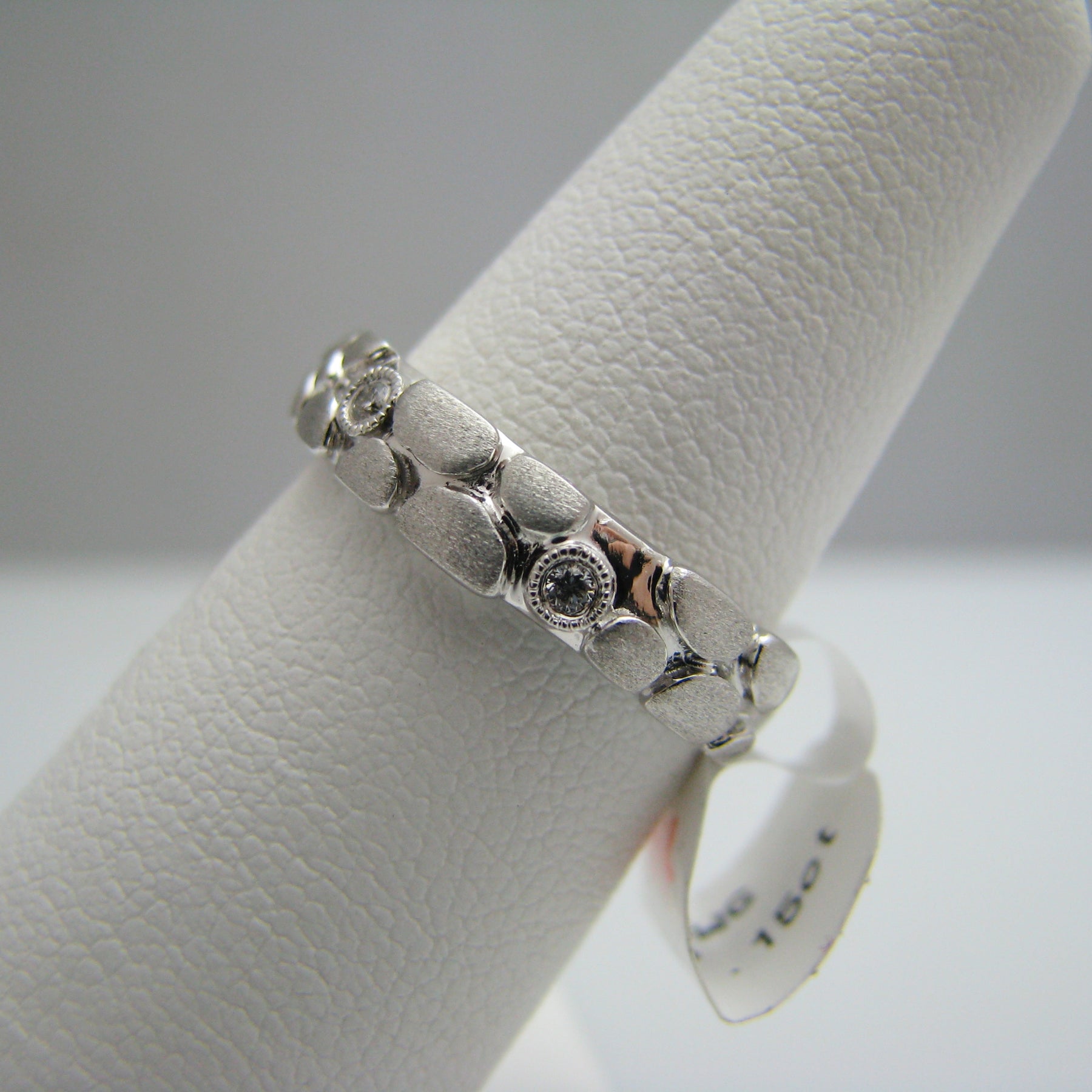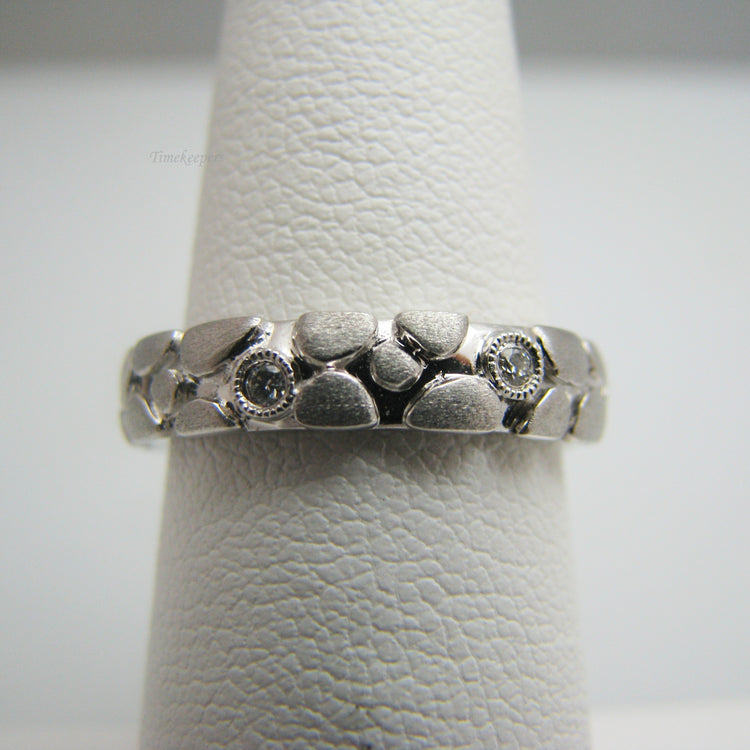 This wedding ring contains five (5) diamonds, embedded in a nugget-like band. It is stamped.