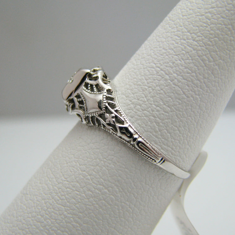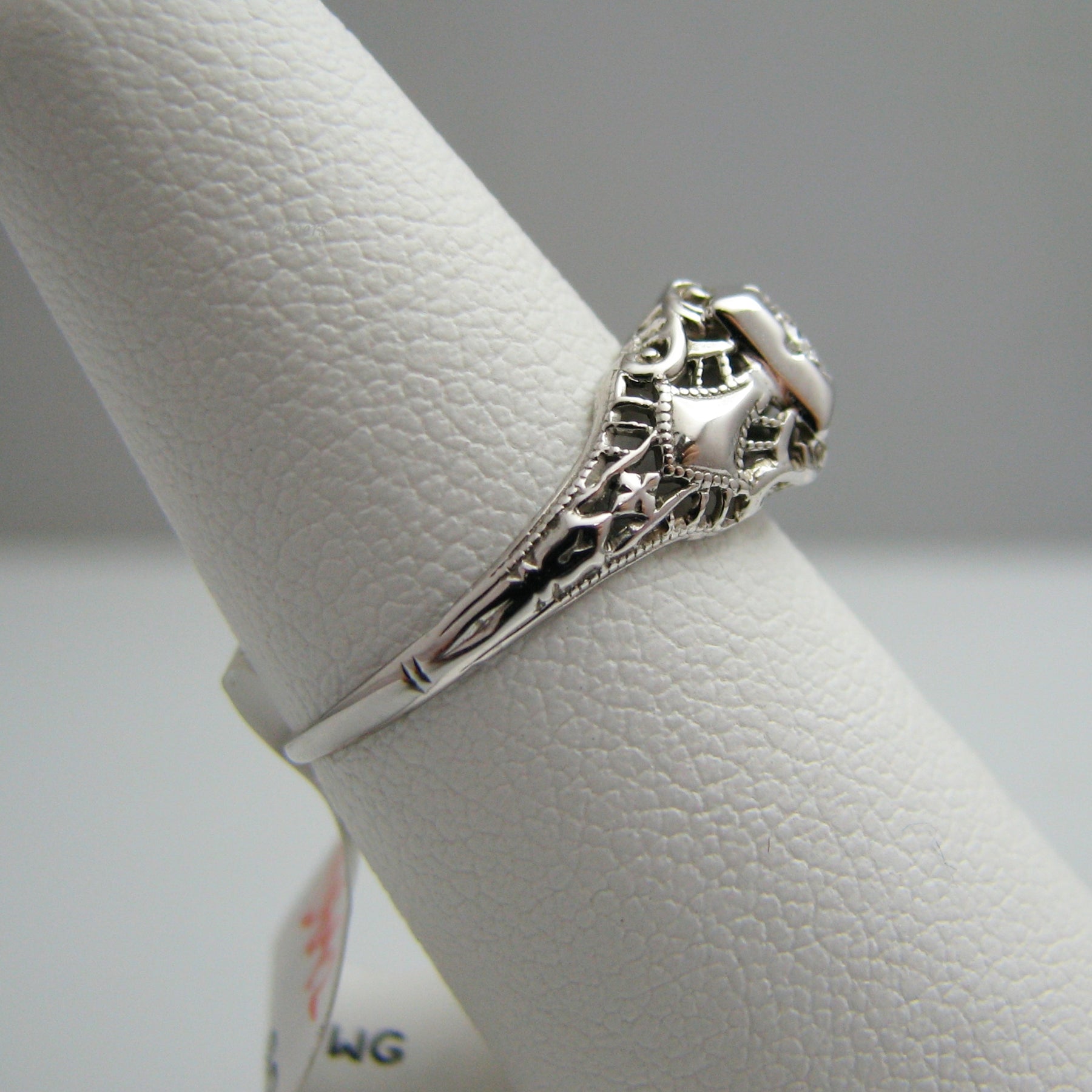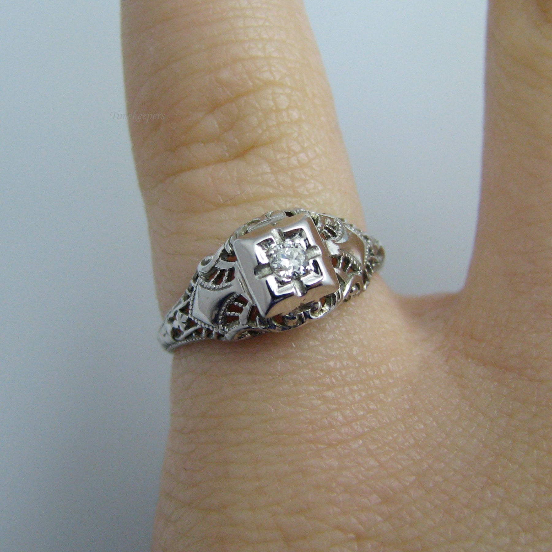 This ring contains one diamond (round cut) which is accentuated by delicate filigree detailing in the band. It is stamped.