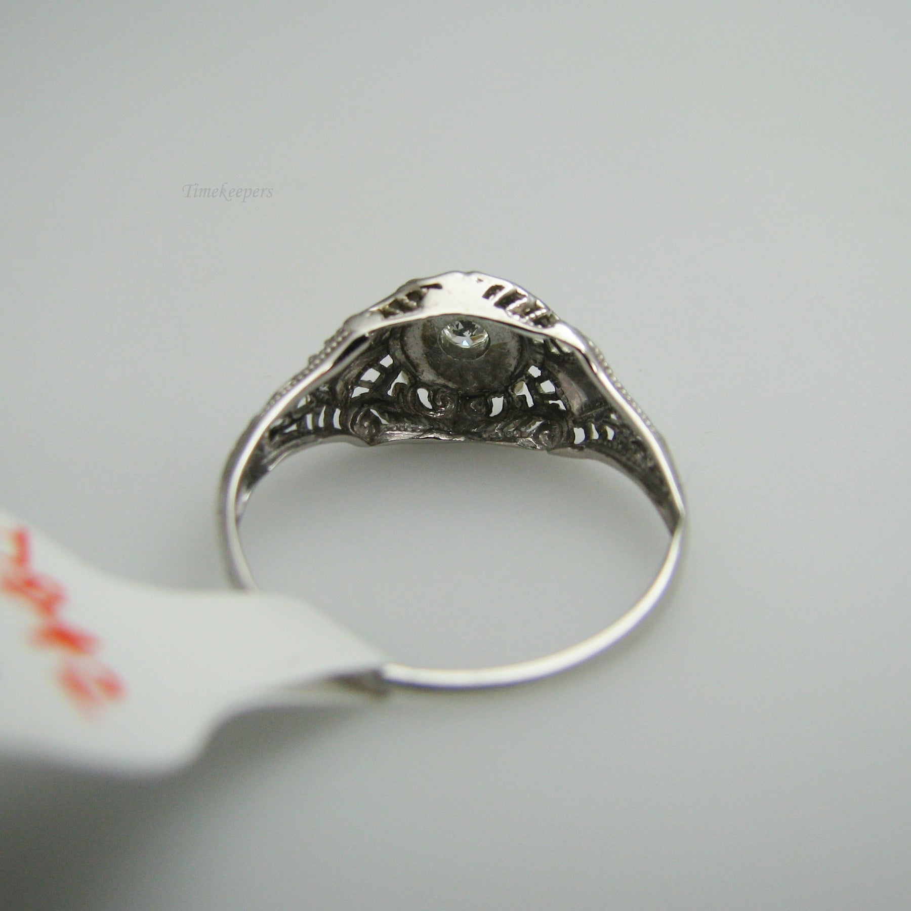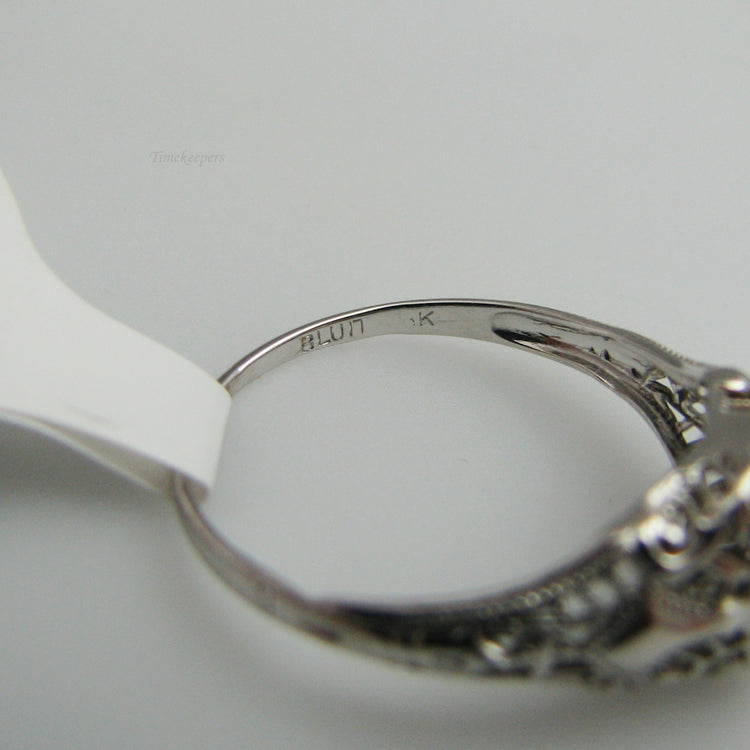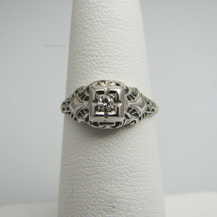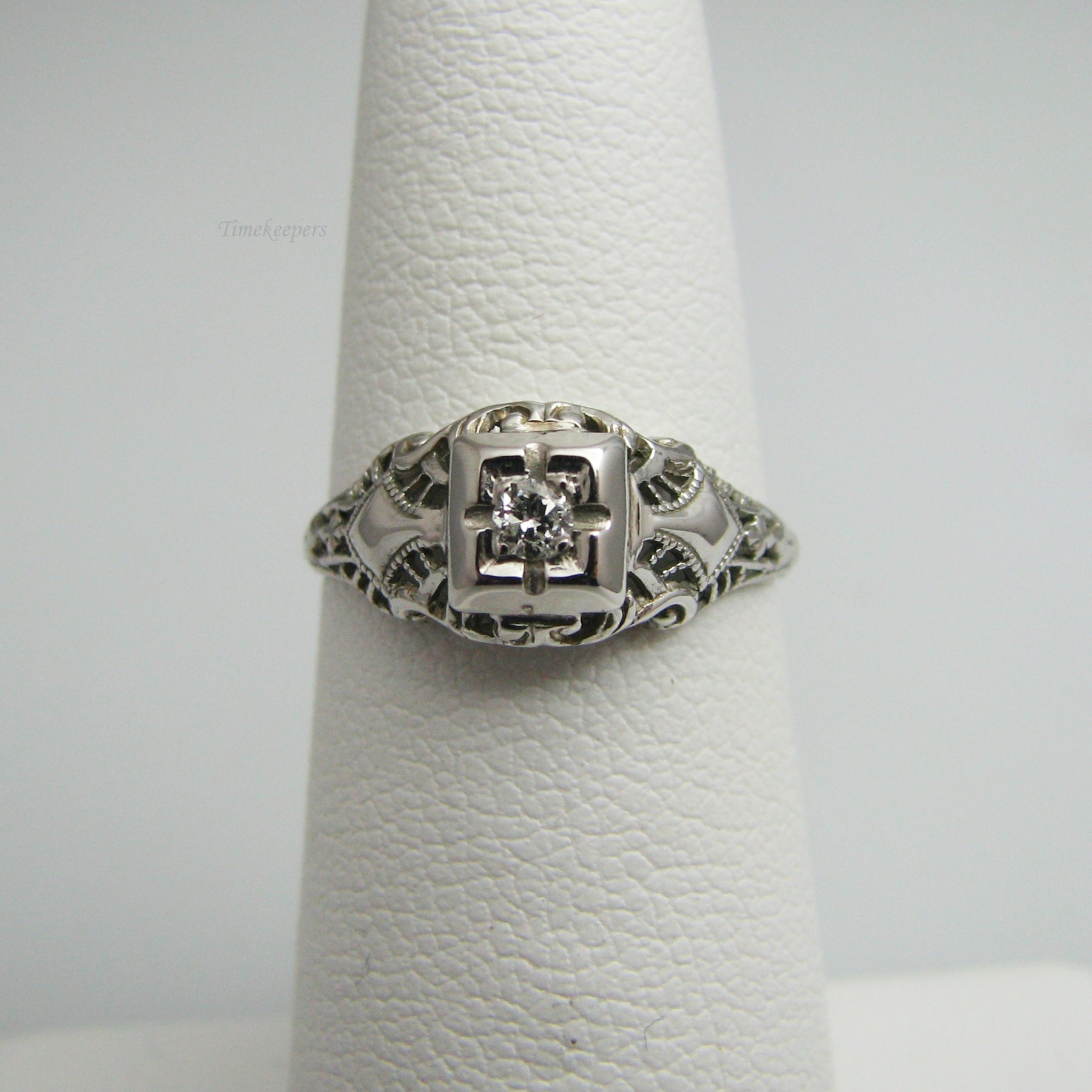 This ring contains one diamond (round cut) which is accentuated by delicate filigree detailing in the band. It is stamped.