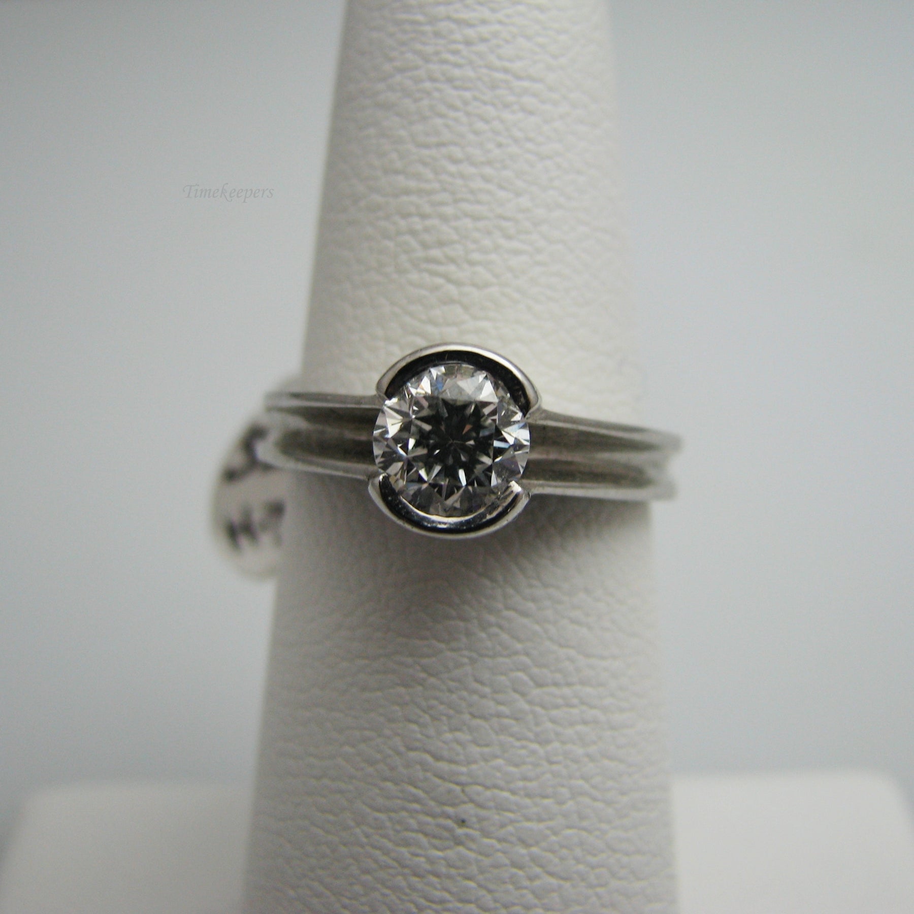 This ring contains one large diamond (round cut) that is set in a simple, elegant band. Shank is stamped