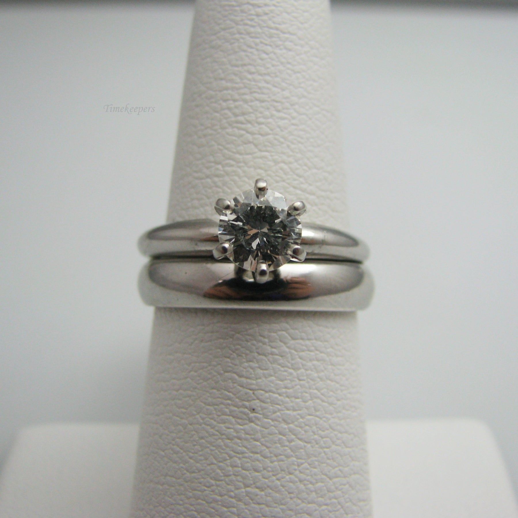 This ring set contains one large diamond (round cut). The bands are simple and draw attention to it. This ring is stamped.