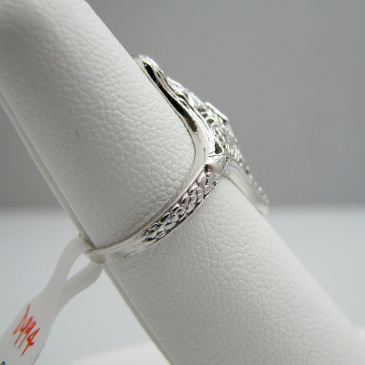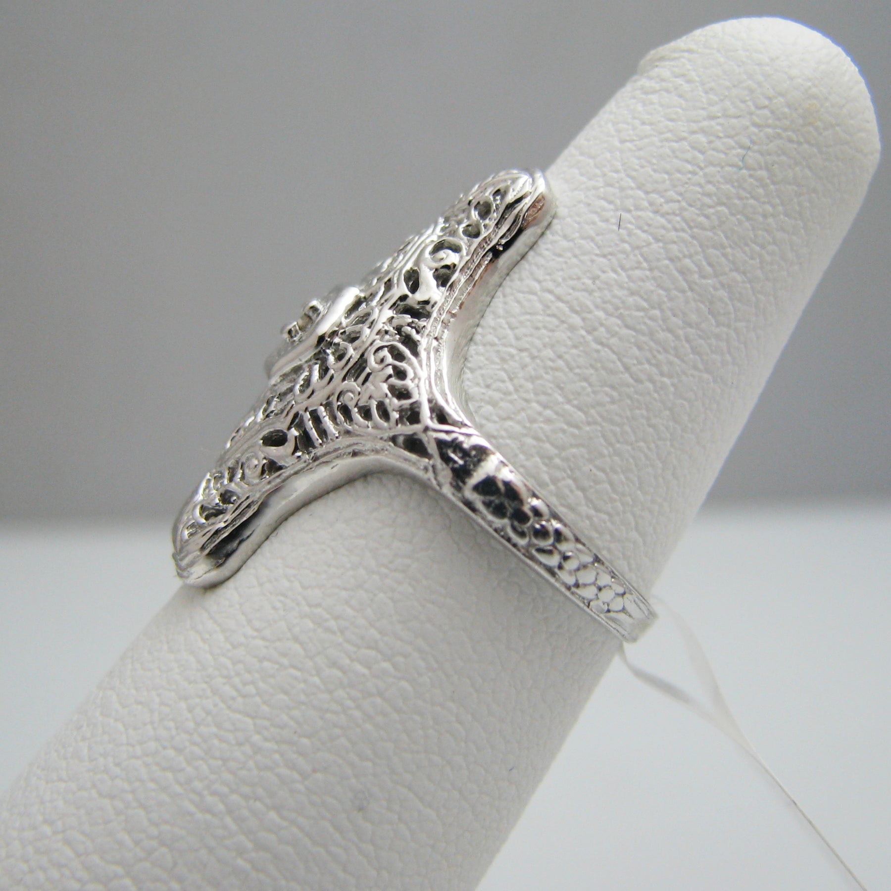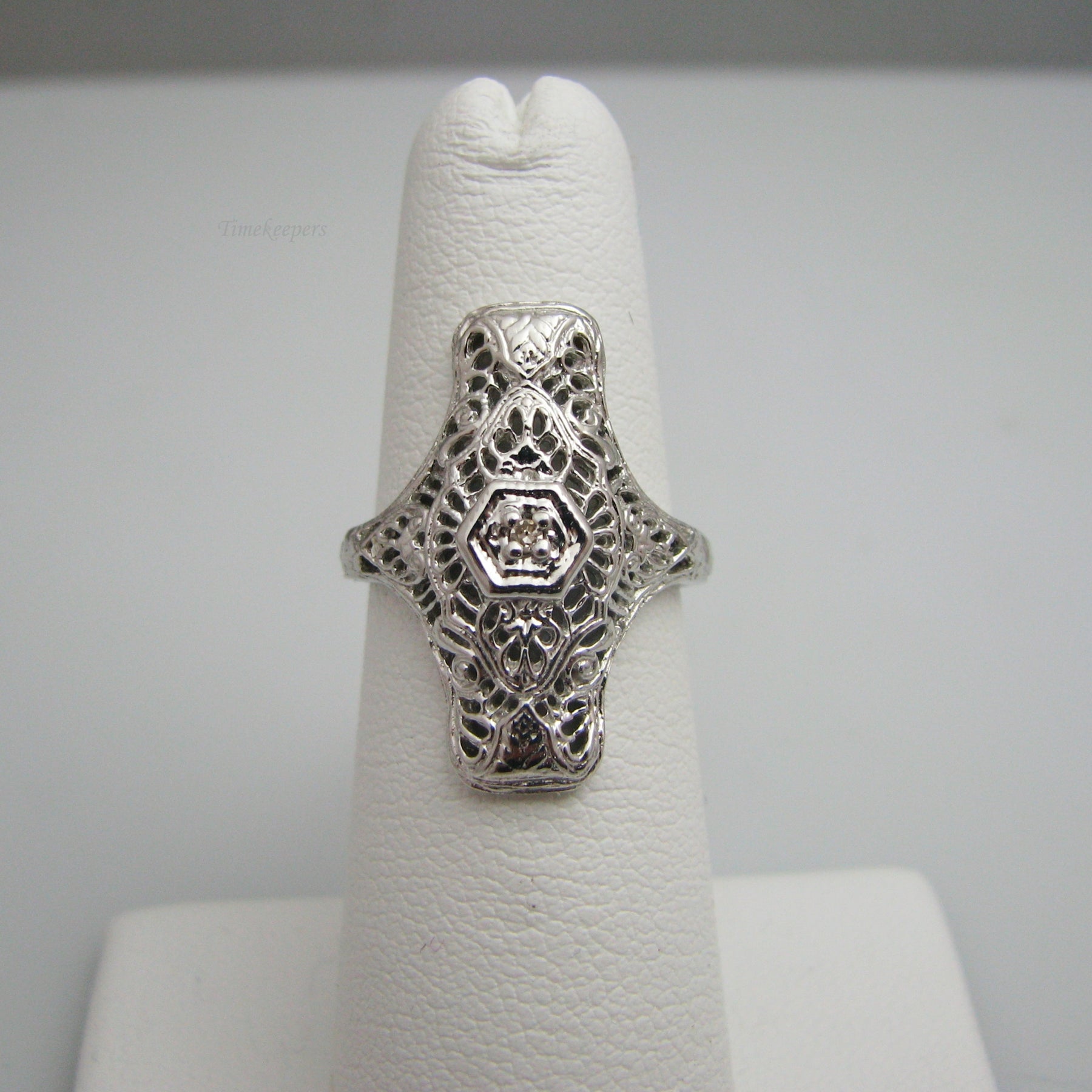 This ring contains one diamond (round cut). It is highlighted by fine filigree detailing. It is stamped.