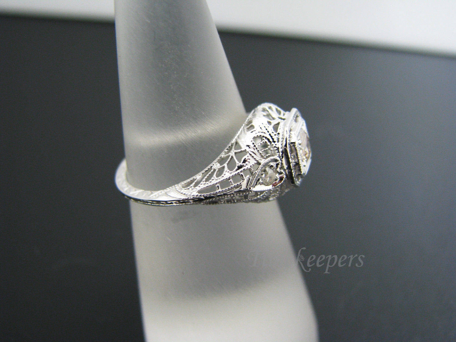 This stunning ring features a center .20 ct diamond with a smaller .07 ct diamond on either side. This is a beautiful filigree mounting with the band decorated all the way around. The inside of the ring is stamped 18k. The diamond boosts a yellow hue.
