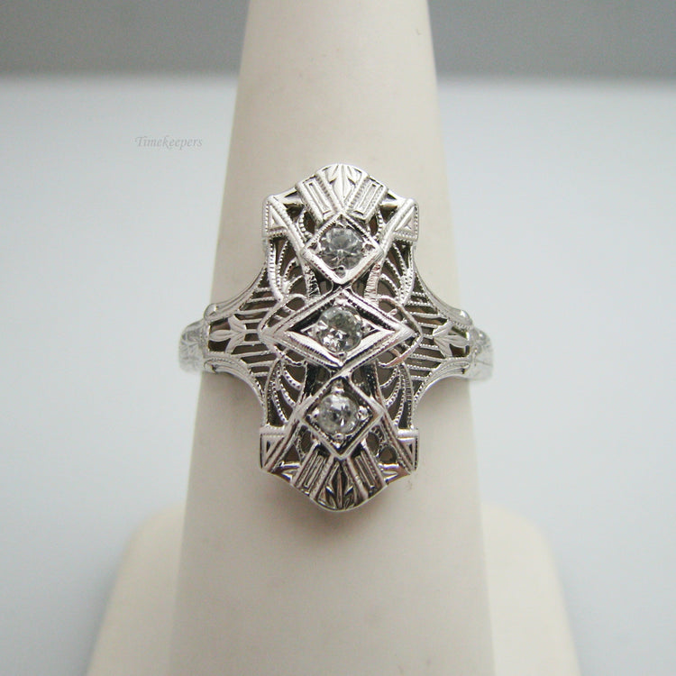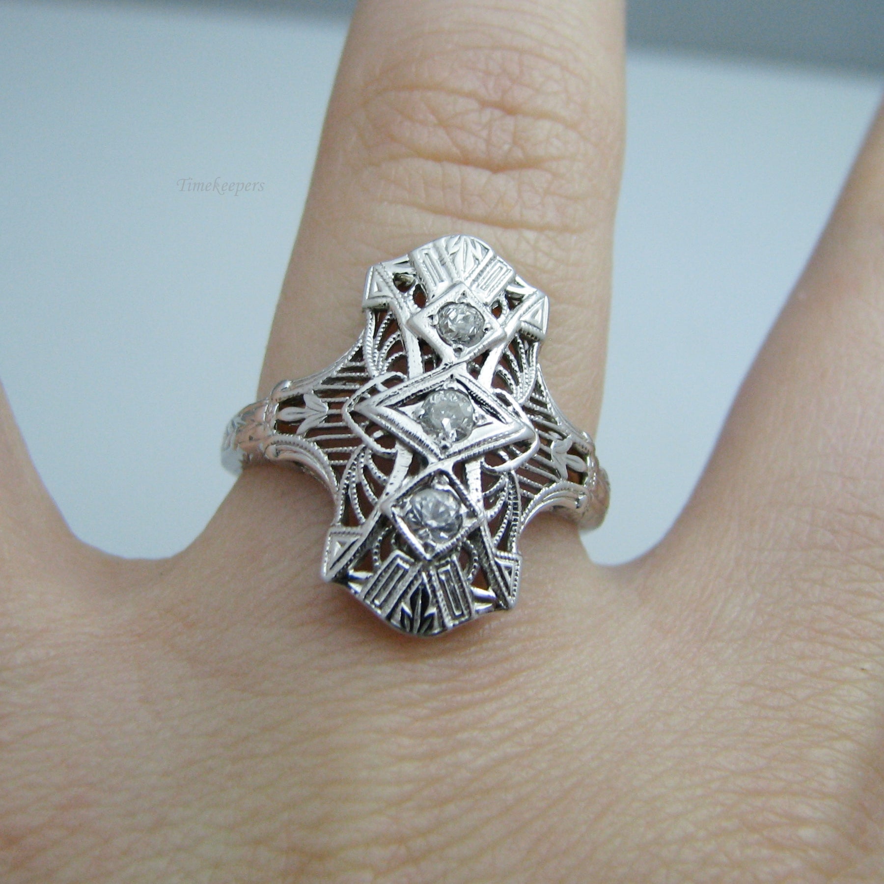 This ring contains three diamonds, all of which are round cut. It is not stamped, but has been tested for authenticity.