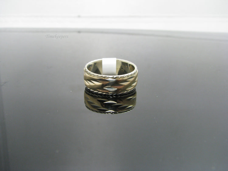 This is a Beautiful Yellow/white Gold wedding band. It has unique almost diamond shaped etchings on the band. It is a size 5, so it's perfect for a smaller sized finger. A classic yet eye catching ring.